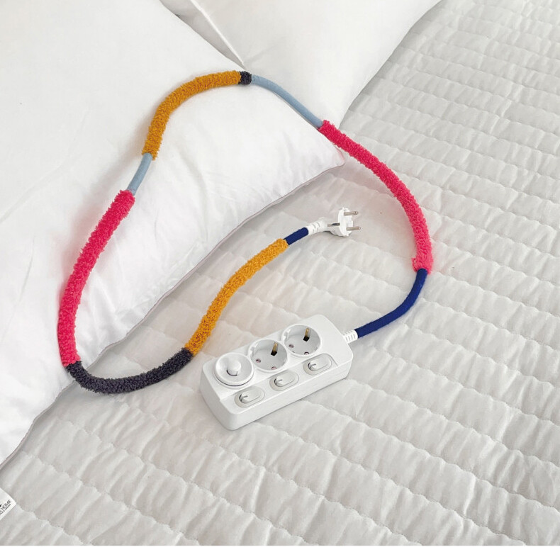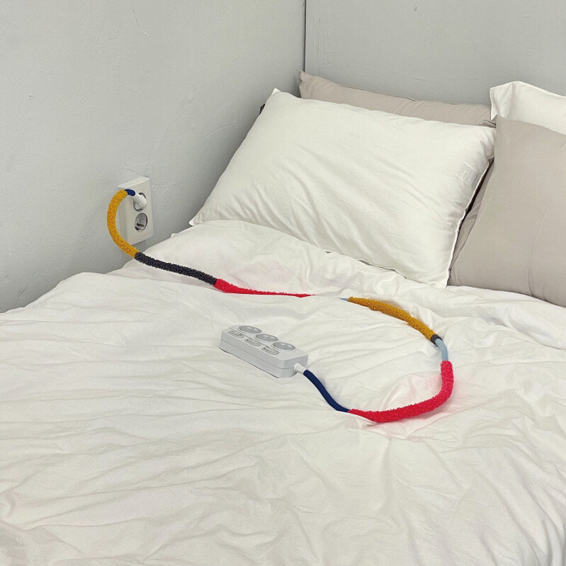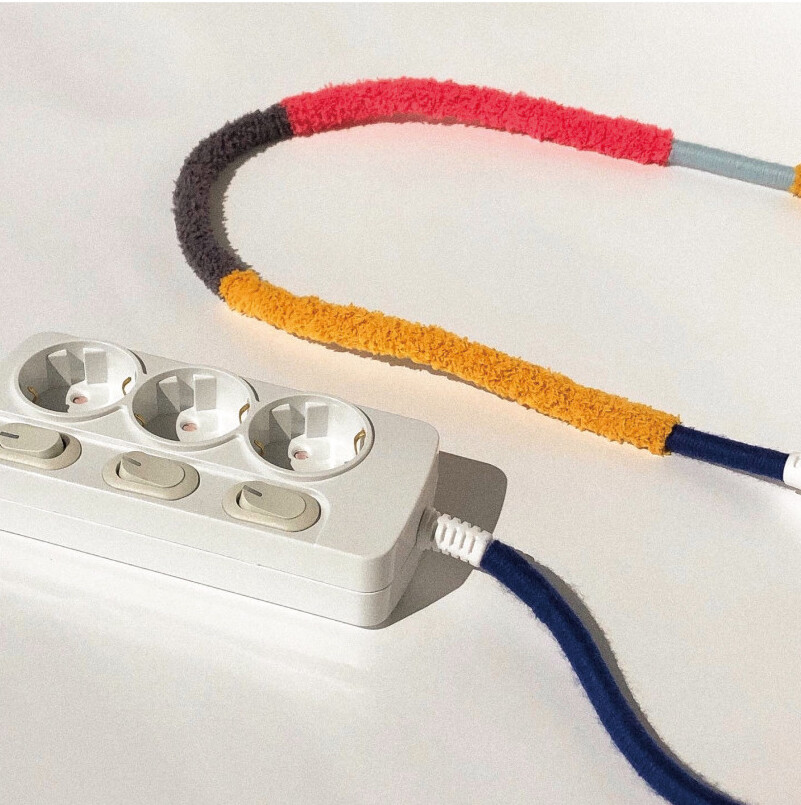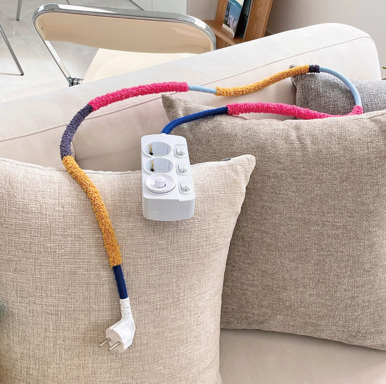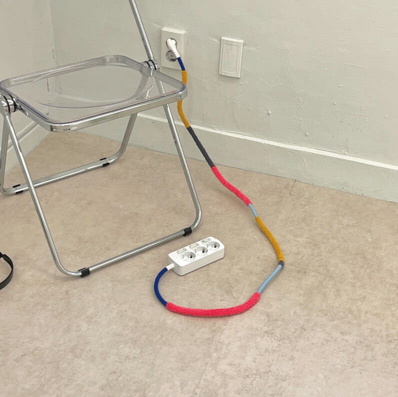 다양한 형태와 색감의 실을 이용해 제작한 핸드메이드 커스텀 멀티탭입니다. 심심한 형태의 멀티탭 선에 재미난 색감과 입체적인 형태를 더함으로써 어디에든 어울리는 인테리어 소품으로 탈바꿈했습니다.