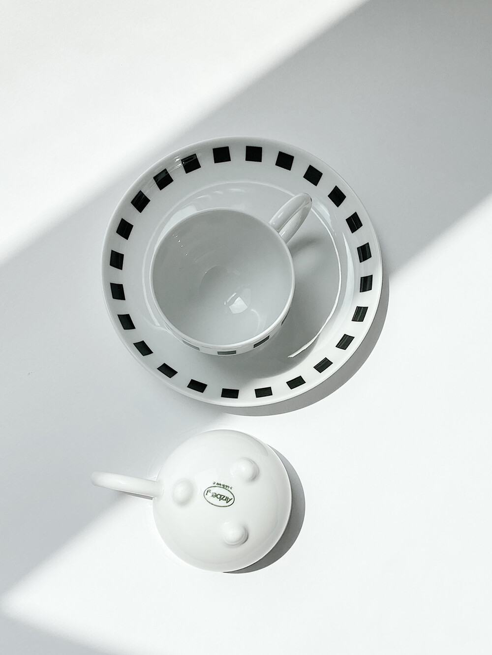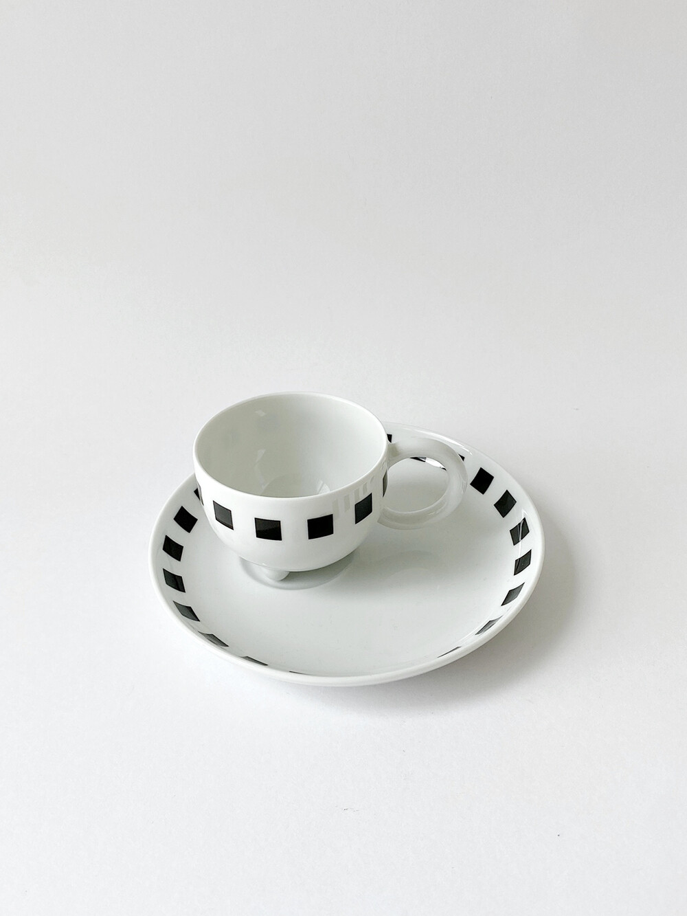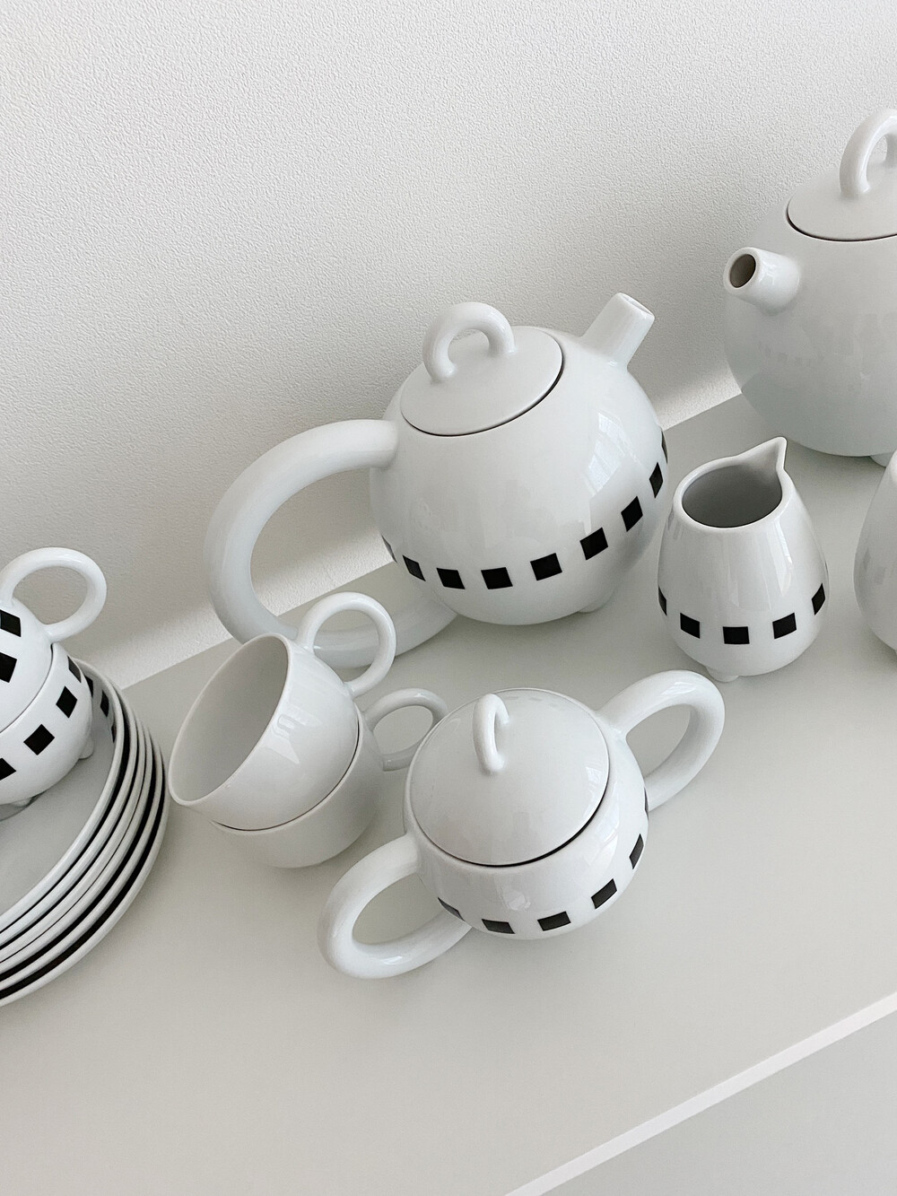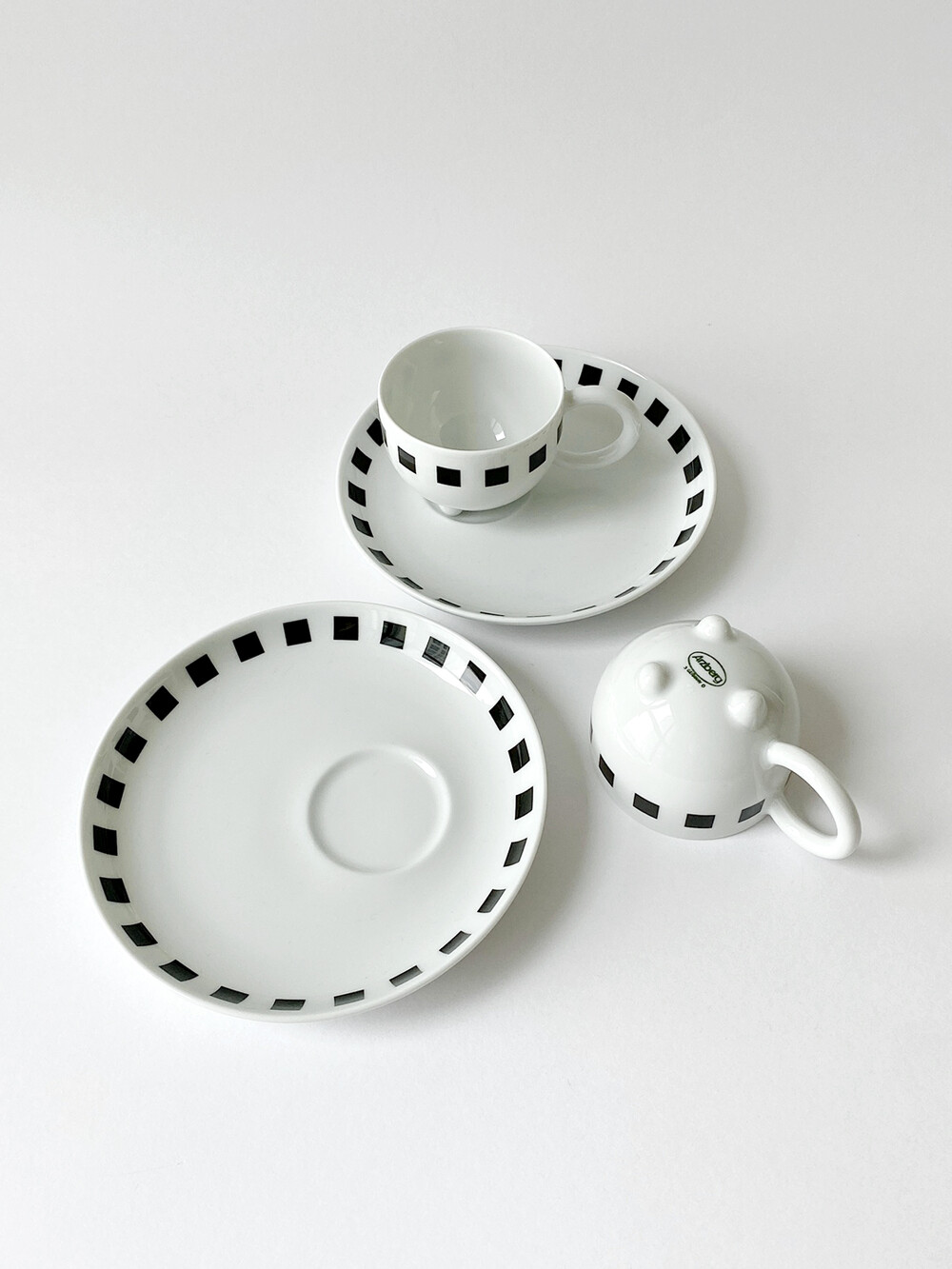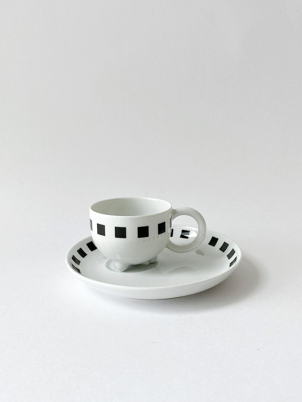 1987년 이태리 건축가이자 디자이너 마테오 툰이 독일 세라믹 브랜드 알쯔버그를 위해 디자인한 컵앤소서 세트입니다. 아방가르드한 실루엣이 인상적이 제품으로, 둥근형태의 손잡이와 받침다리가 참 귀여운 제품입니다. 또한 솔리드 버전이 아닌 큐브 밴드 디자인으로 희소한 가치가 있답니다.