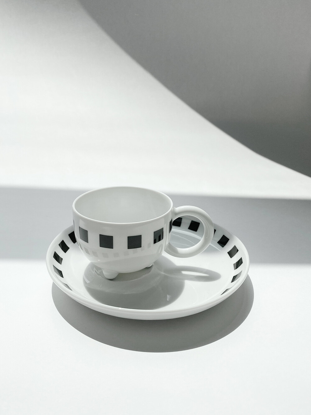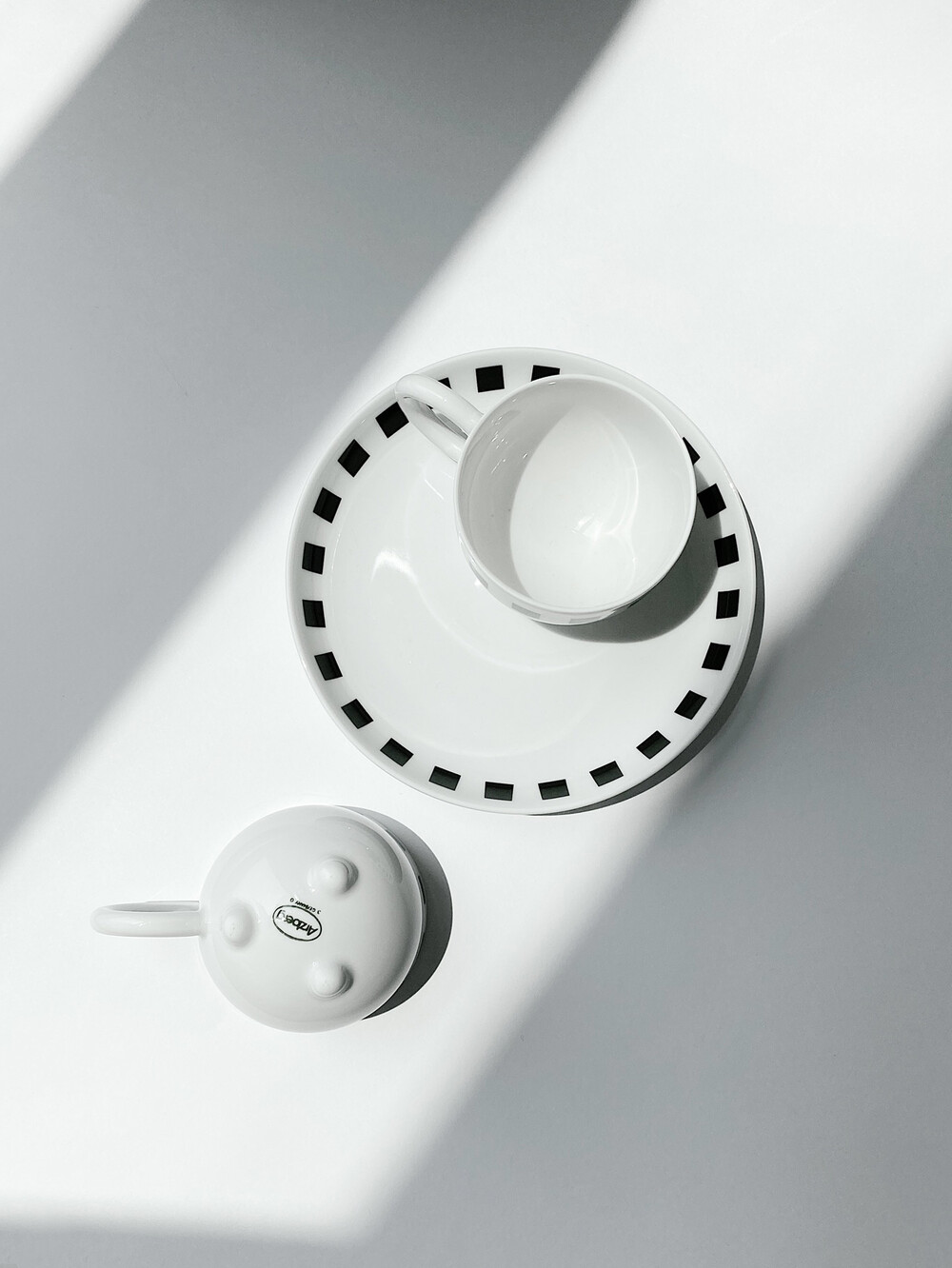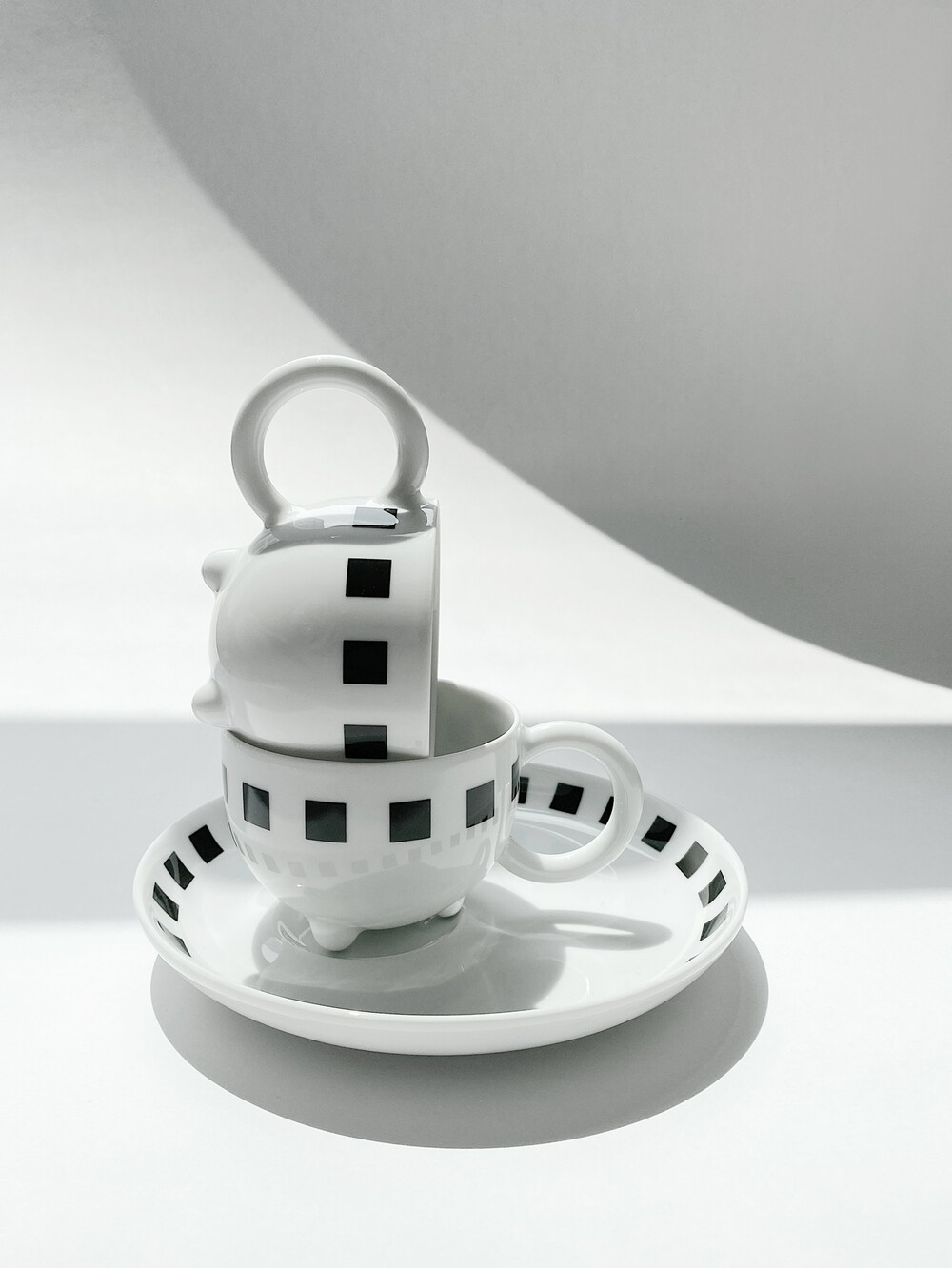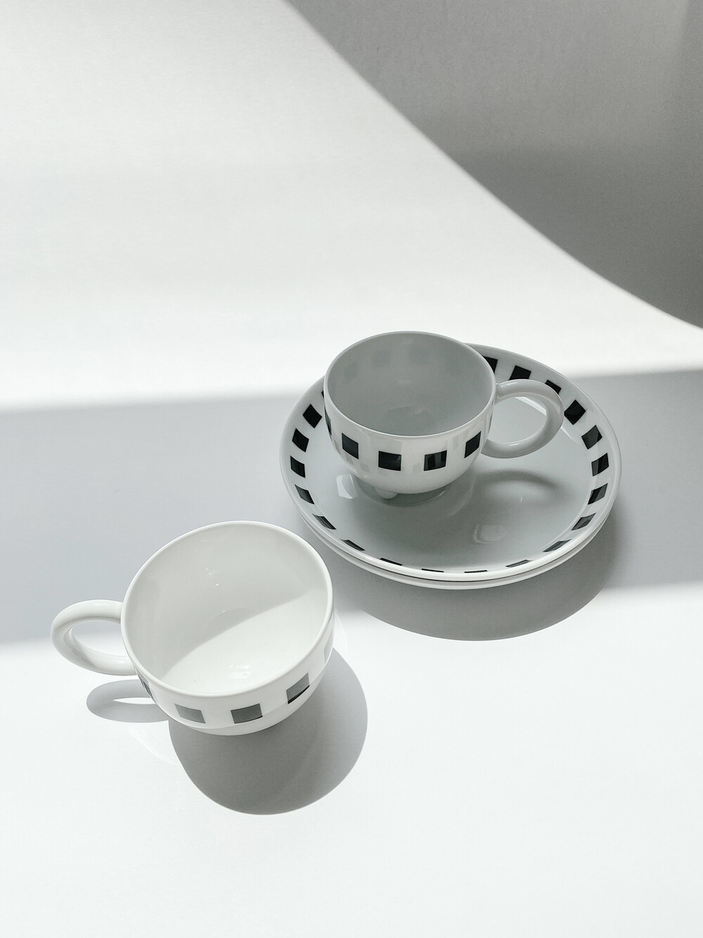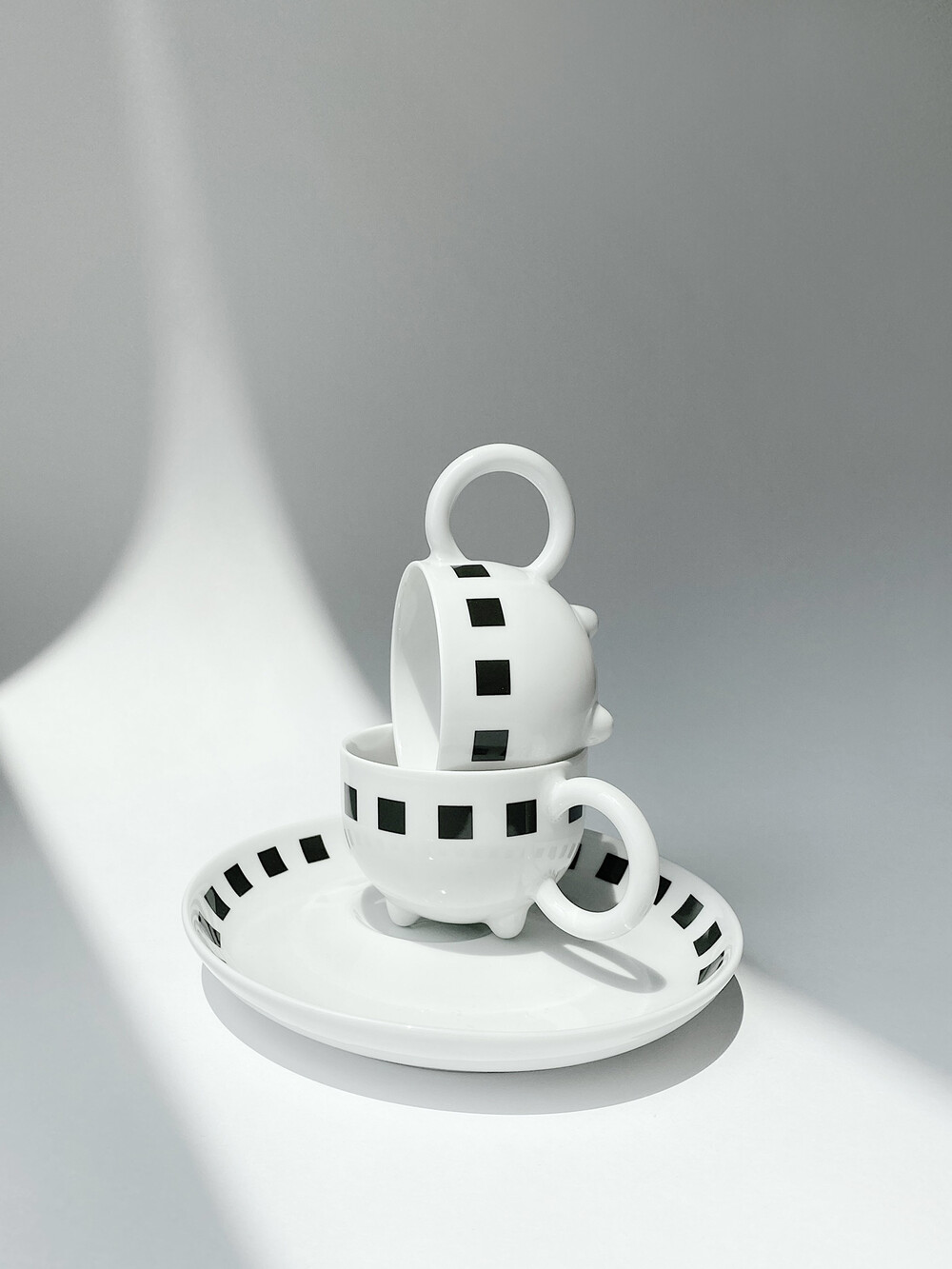 1987년 이태리 건축가이자 디자이너 마테오 툰이 독일 세라믹 브랜드 알쯔버그를 위해 디자인한 컵앤소서 세트입니다. 아방가르드한 실루엣이 인상적이 제품으로, 둥근형태의 손잡이와 받침다리가 참 귀여운 제품입니다. 또한 솔리드 버전이 아닌 큐브 밴드 디자인으로 희소한 가치가 있답니다.