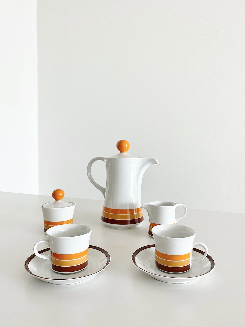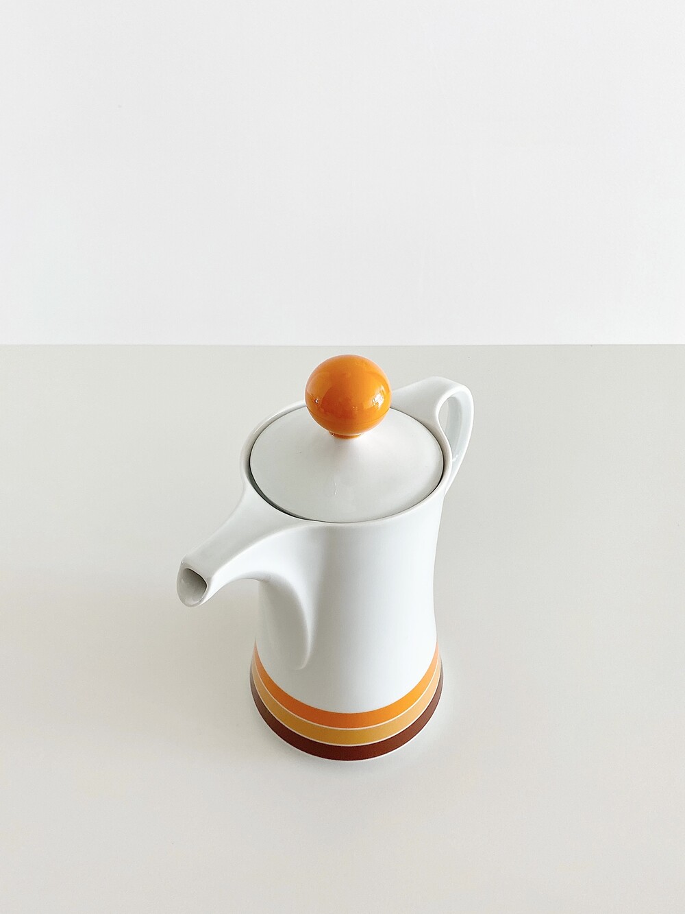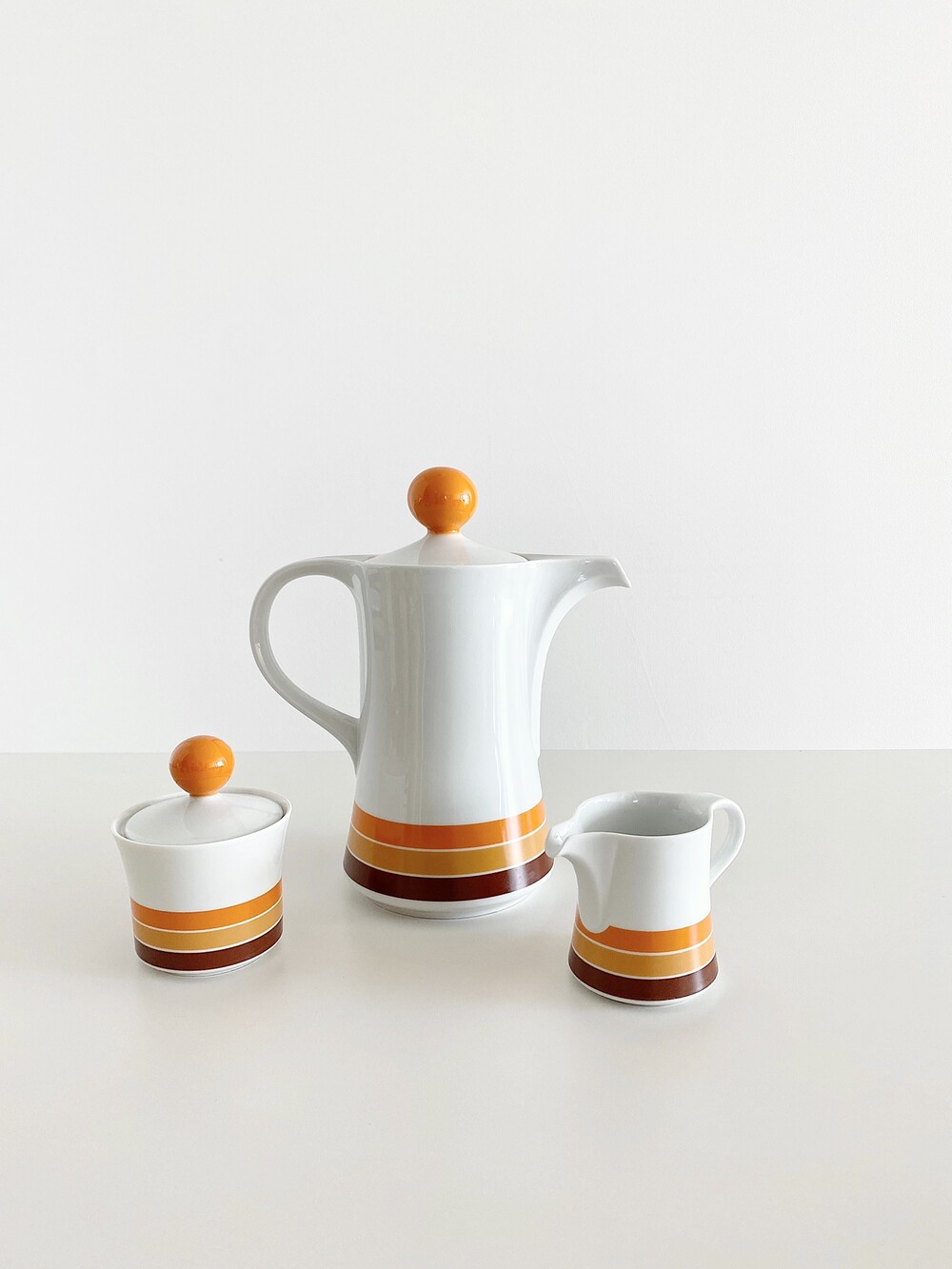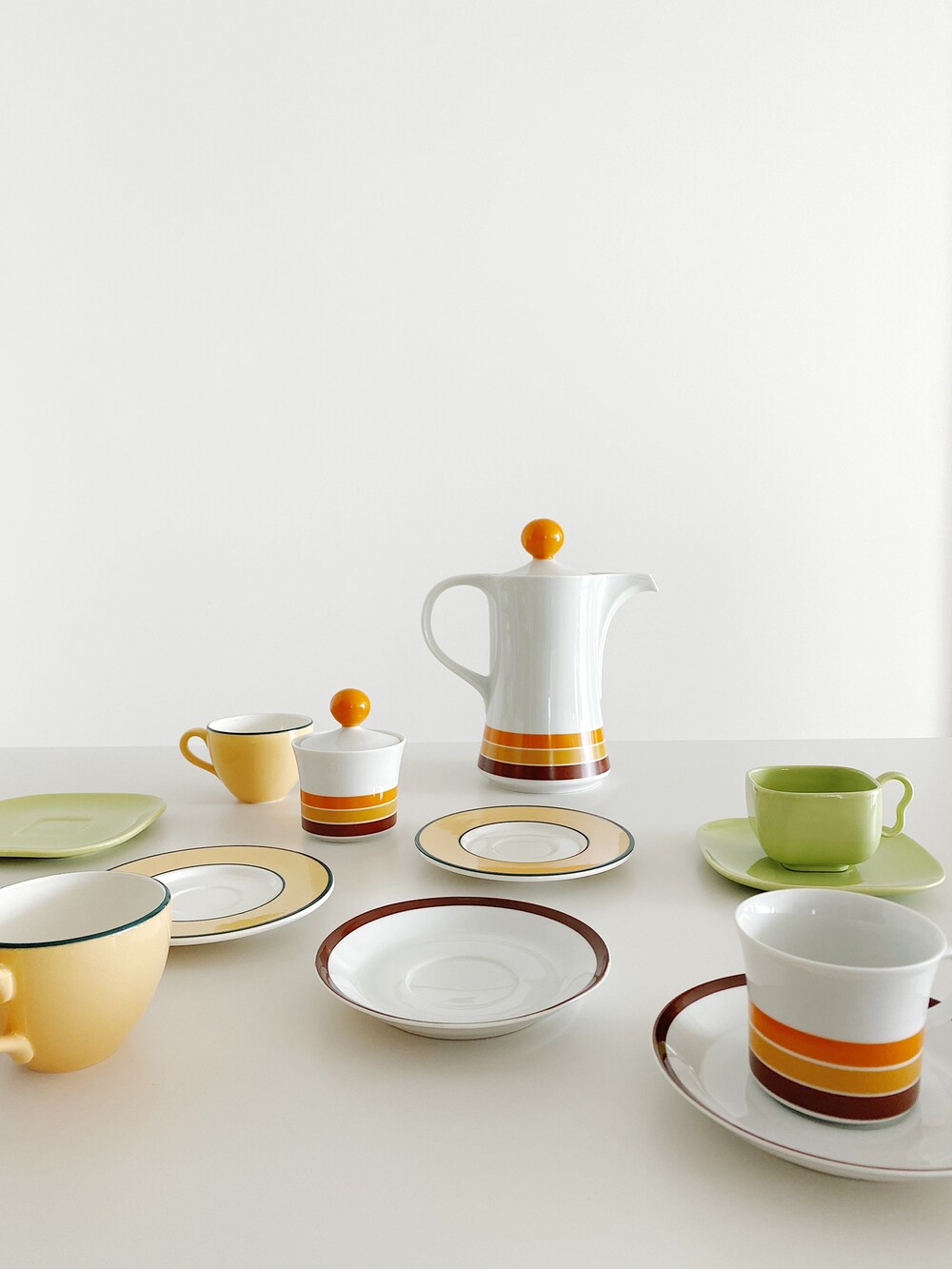 70년대 독일에서 제작된 미터타이히 바바리아 티팟 세트입니다. 미드센츄리 무드가 물씬 묻어나는 컬러 배색과 재미있는 실루엣이 돋보이는 제품입니다. 독일에서 시작된 미터타이히 바바리아는 2007년 터키 자본에 인수되어 이후부터 생산된제품은 독일에서 생산된 제품이 아니며 백마크에 Bavaria 표기가 없습니다. 그렇기에 더욱 소장 가치가 있는 제품입니다.
