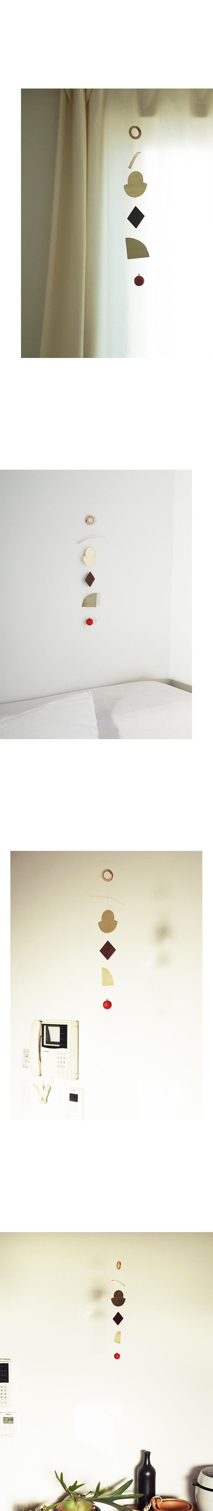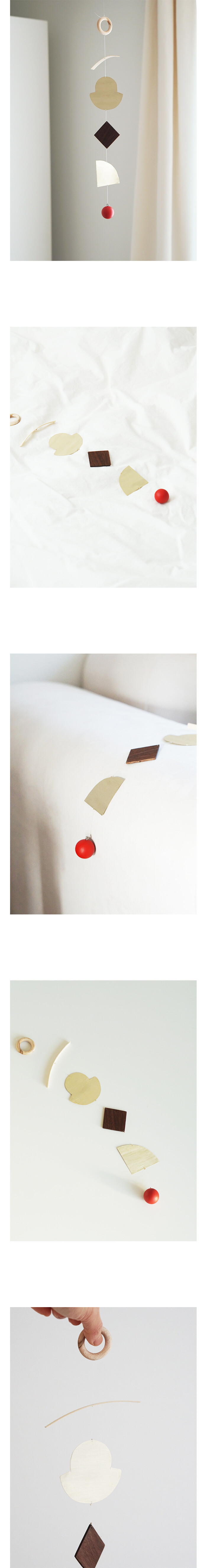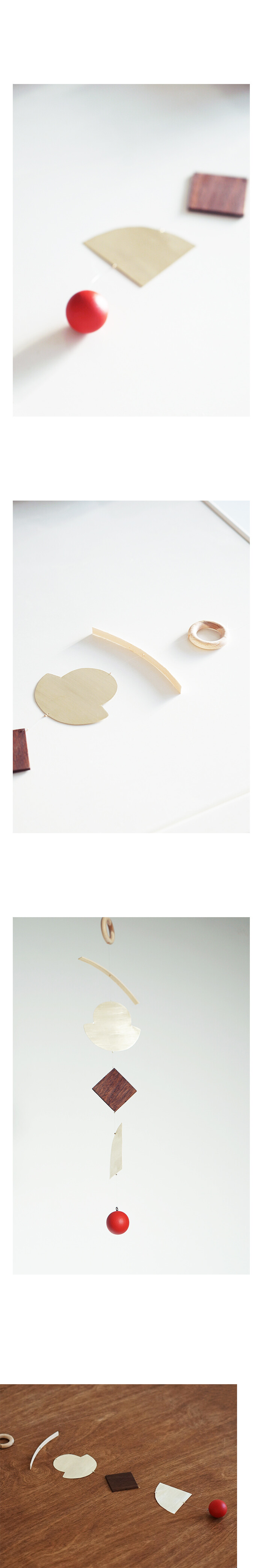 열매, 결실을 맺길 기원하는 모빌입니다. 금빛의 황동과 호두나무가 어우러져 조화롭습니다. 열매를 맺기 위한 일련의 과정들을 기호화하여 만든 모양들을 조합했고, 붉은 공은 아름답게 결실을 맺은 복스러운 열매를 상징합니다. 벽면에 설치하면 늘 한결같은 모습으로 있어주고 공중에 설치하면 빙글빙글 돌아가며 다양한 표정을 보여줍니다. 일상에서의 작은 기쁨이 되어주길, 모두가 저마다의 결실을 맺고 충만함을 느끼기를 바랍니다. 친구나 지인에게 가볍게 선물하기에도 좋습니다.