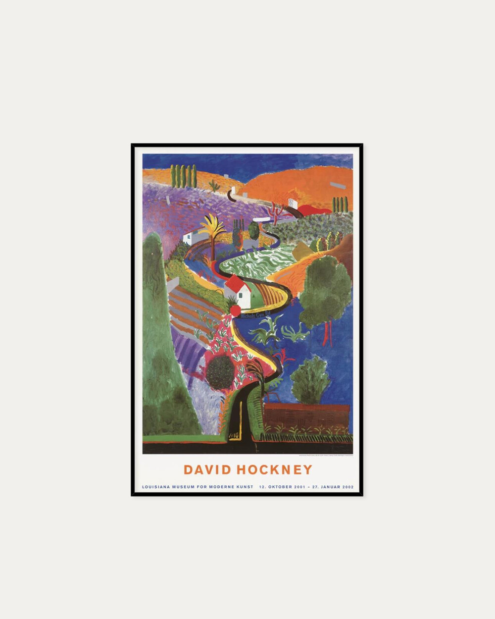 2001년 루이지애나에서 열린 David Hockney 전시 포스터 입니다. 포스터 디자인 모티브는 Nichols Canyoun 1980 작품으로 캘리포니아 로스앤젤스에 위치한 니콜스 캐년의 실제 지역을 나타내며, 언덕 꼭대기에 있는 그의 집의 관점에서 바라본 작품입니다 호크니 특유의 생동감있는 컬러를 활용한 컬러 패치워크가 인상적인 작품입니다.