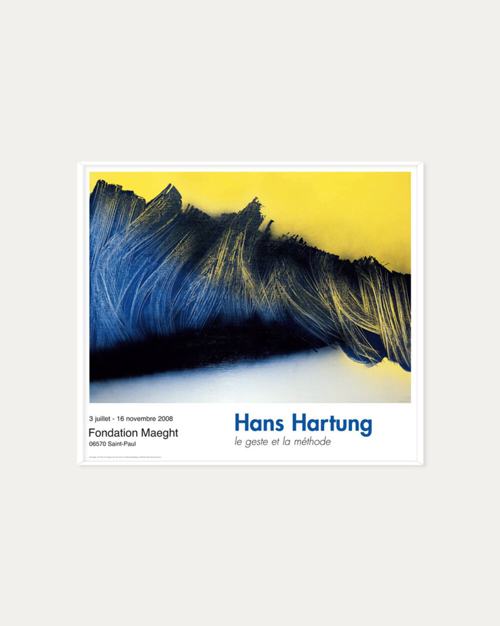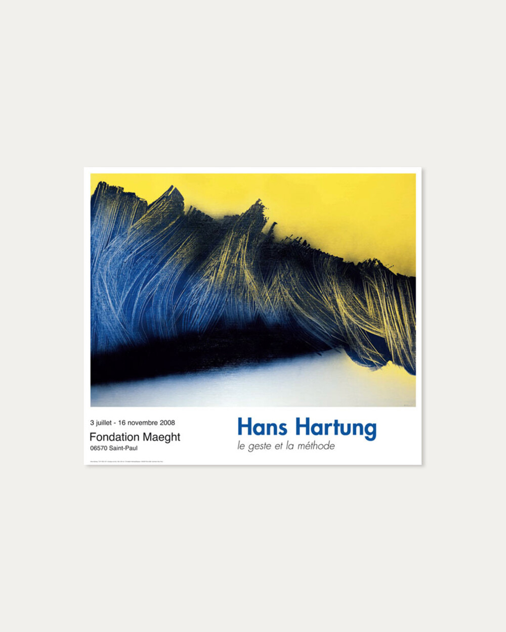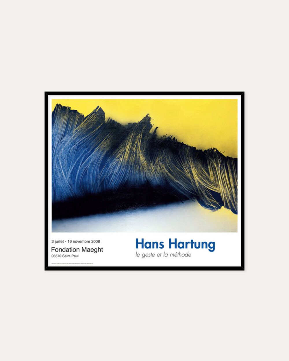 독일 출신의 프랑스 추상화가 한스 하르퉁(Hans Hartung)의 타시즘 작품이 담긴 아트포스터입니다. 한스 하르퉁은 1950년대 유럽에서 유행한 그림을 흘리거나 뿌리는 추상화법인 타시즘 아트의 선구자로 일컬어지며, 화려한 색과 동양의 서체에서 영향을 받은 조형으로 순수추상을 추구하며 액션페인팅에 영향을 주었습니다. 다이나믹한 선의 움직임과 리드미컬한 구성이 두드러진 작품들을 양산한 추상화 분야의 대표적 화가이며 1960년 베네치아 비엔날레에서 수상하며 국제적 명성을 쌓았습니다.