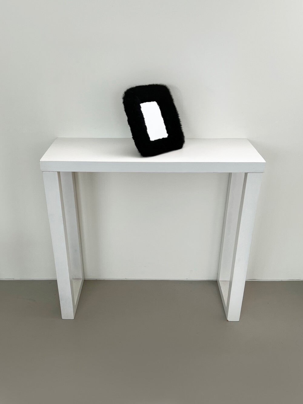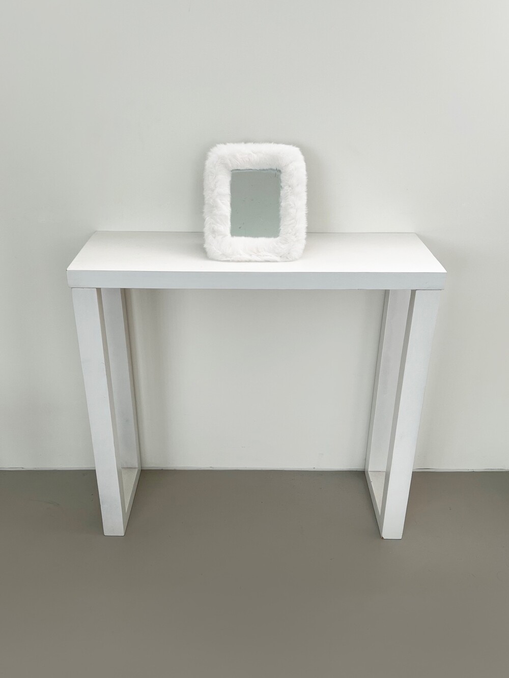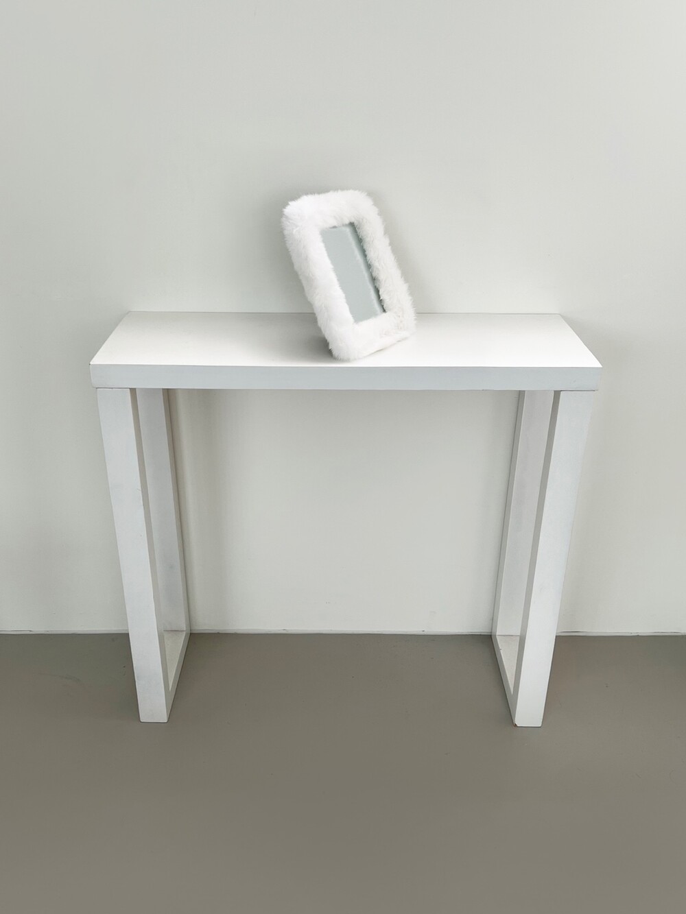 부드러운 퍼 프레임이 돋보이는 사각 프레임의 스탠드 거울입니다. 스탠드 거치대는 각도에 따라 노출될 수 있습니다.