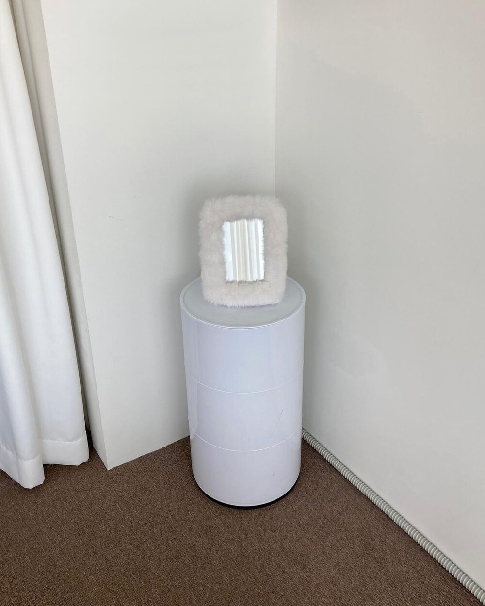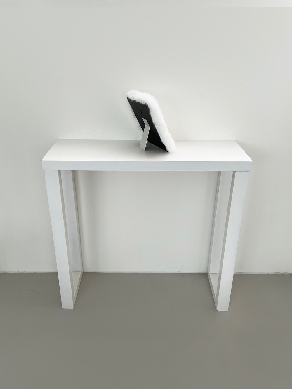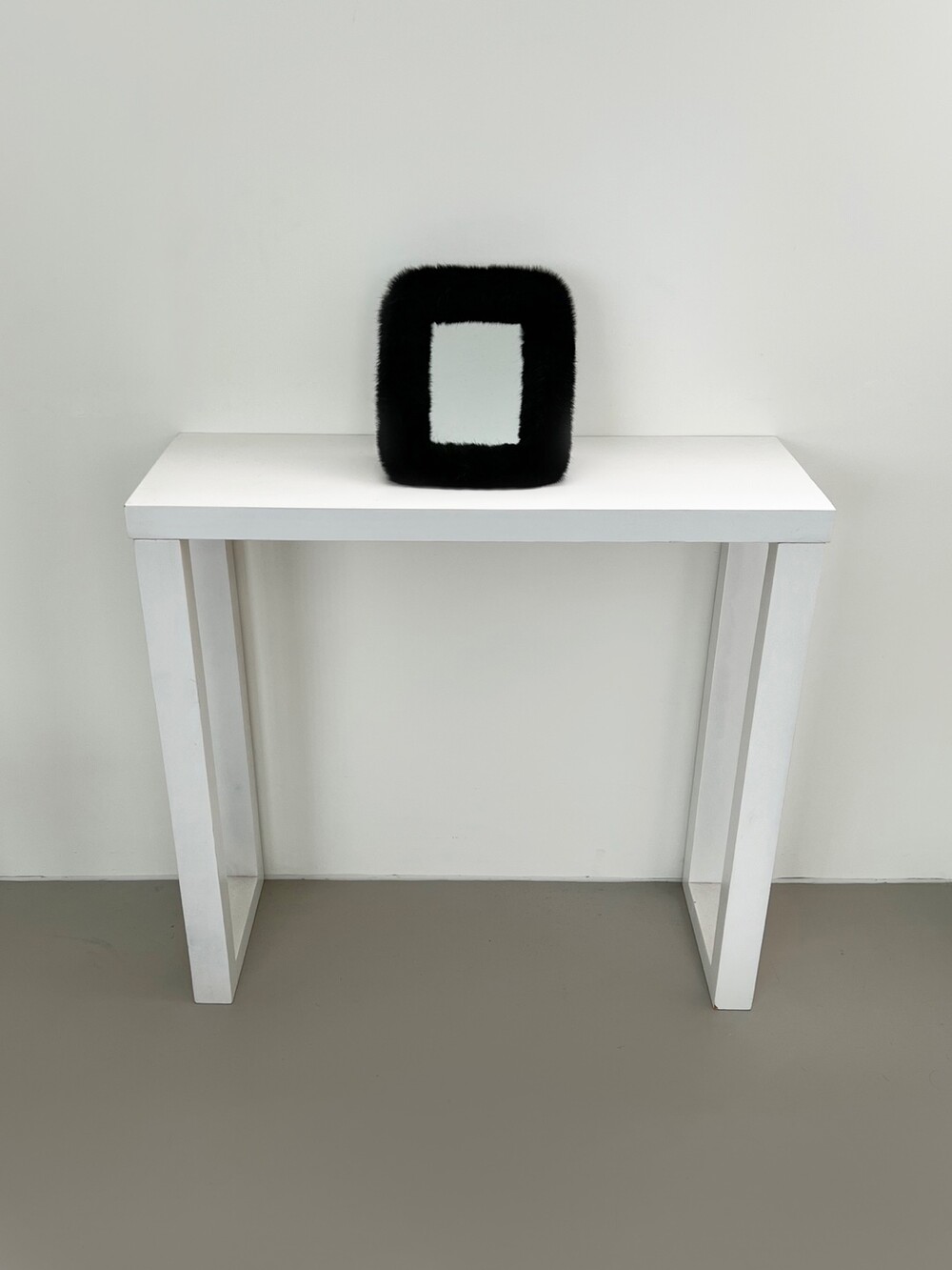 부드러운 퍼 프레임이 돋보이는 사각 프레임의 스탠드 거울입니다. 스탠드 거치대는 각도에 따라 노출될 수 있습니다.