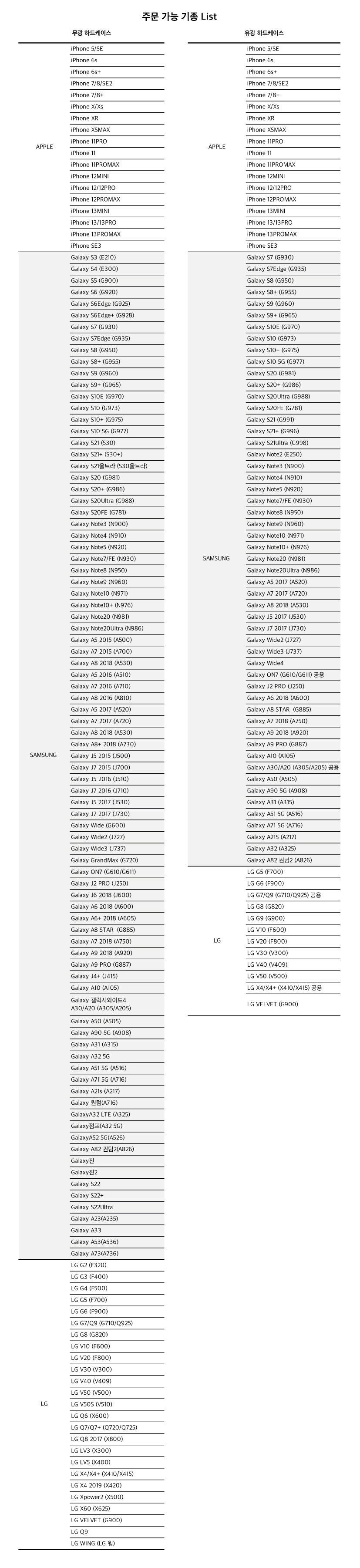 * 하단의 상세페이지에서 주문 가능한 핸드폰 기종을 확인하신 후, '핸드폰 기종'란에 주문하실 기종을 기입해주십시오.
