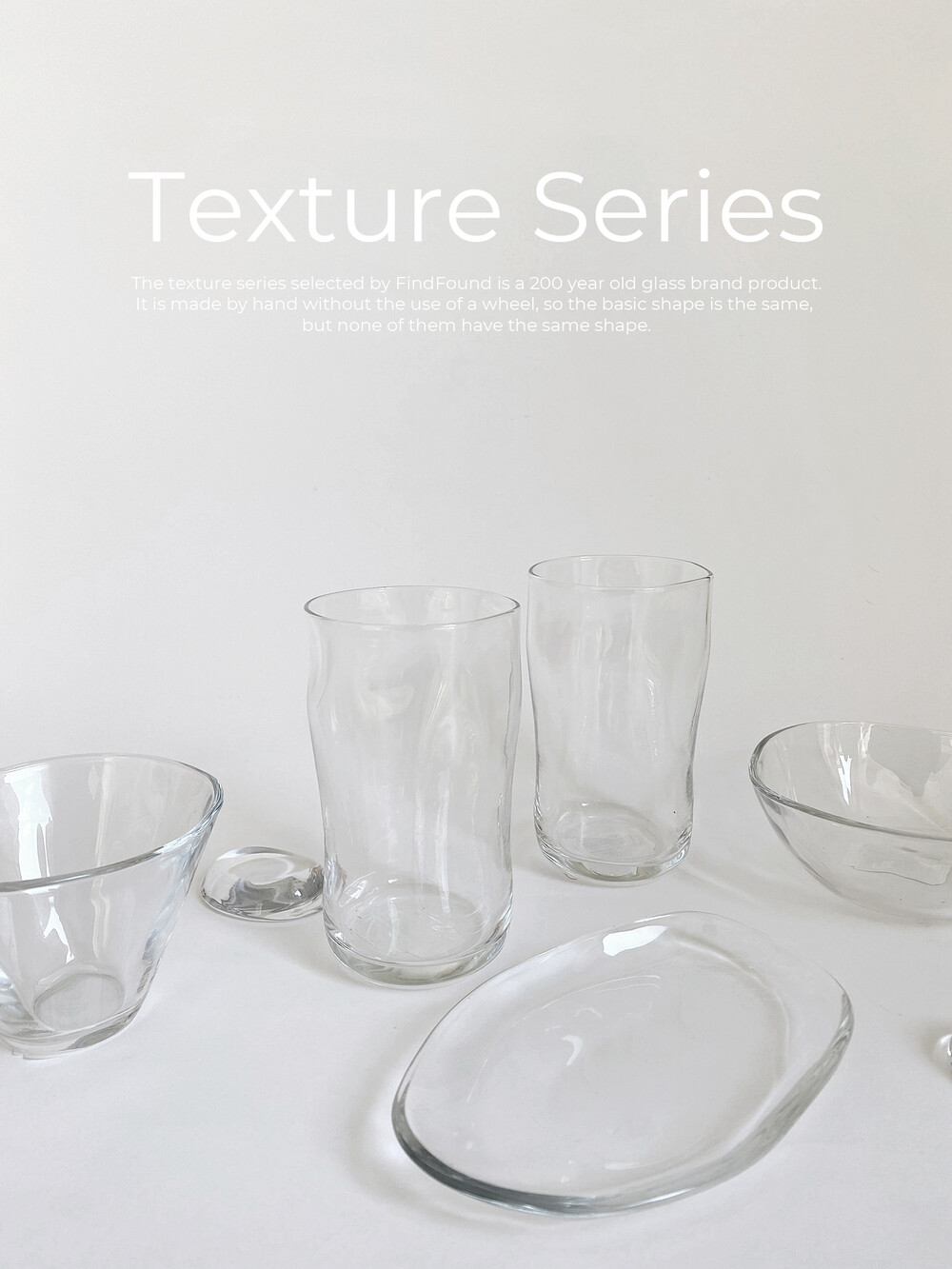 파인드파운드에서 셀렉한 텍스처 시리즈는 200년 전통의 글라스 브랜드 제품 입니다.물레를 사용하지 않고 사람의 손으로 빚어 만들어서 기본적인 형태는 같지만 단 하나도 같은 모양이 없다는 것이 특징입니다.