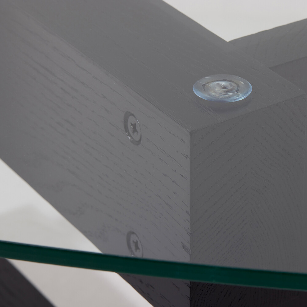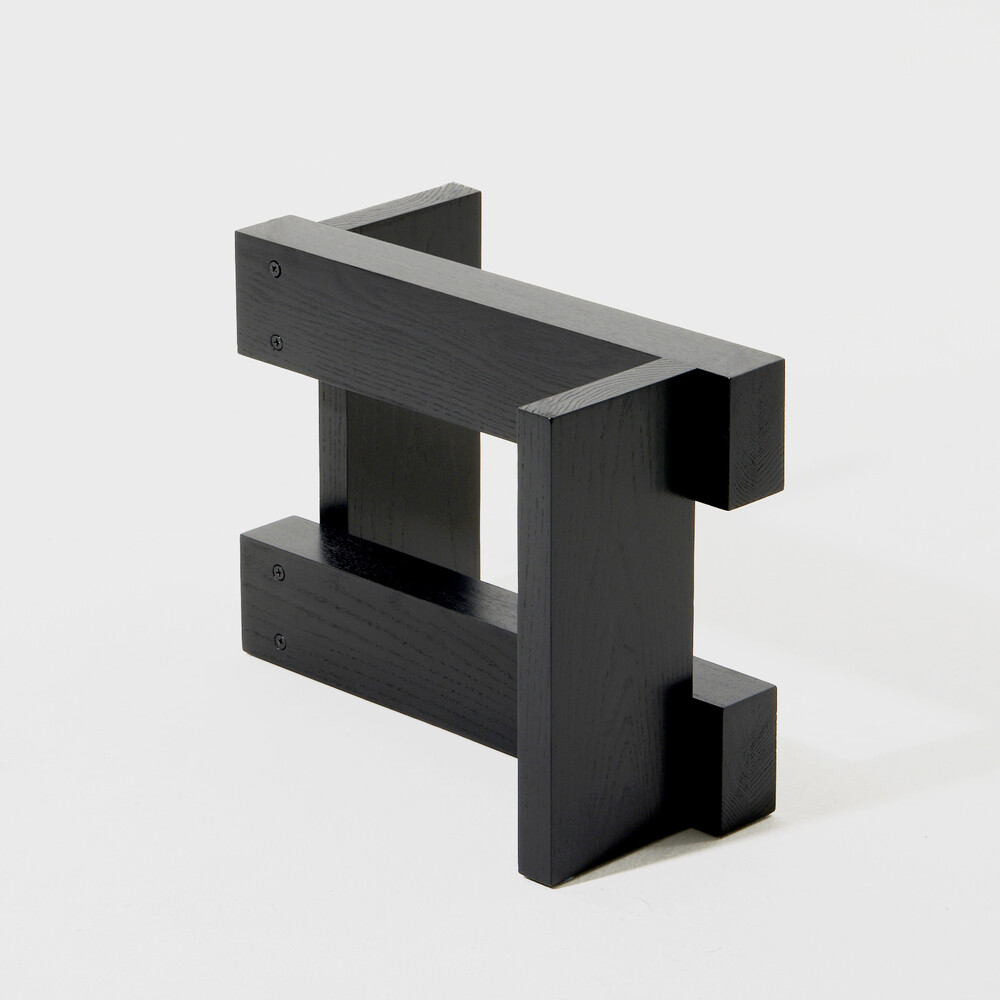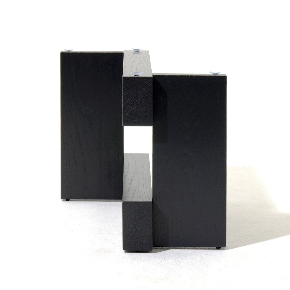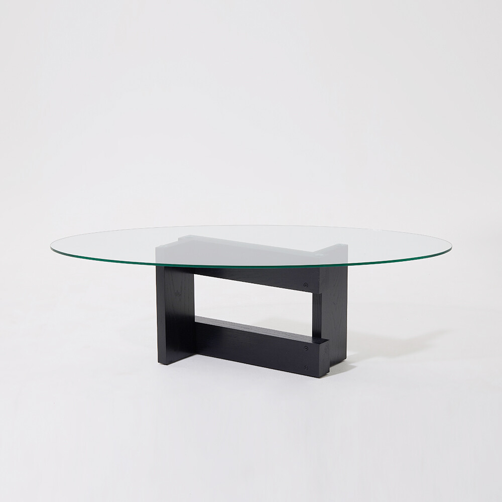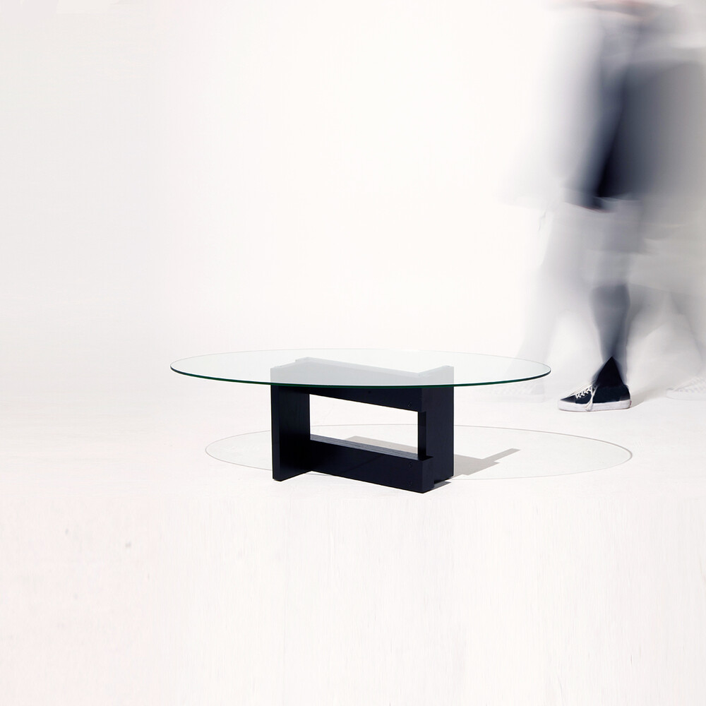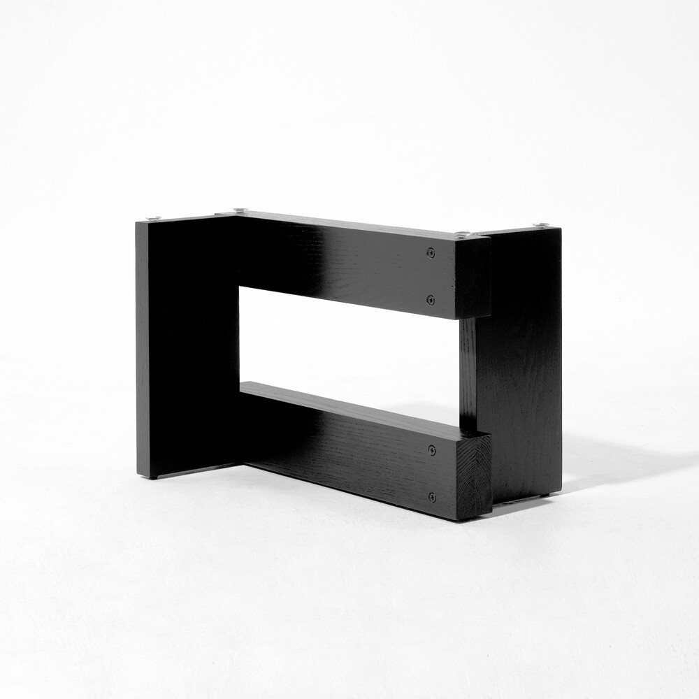 권이안의 ‘무게’시리즈 연작 중 커피 테이블입니다. 보는 시야에 따라 색다르게 보이는 프레임이 특징입니다. 검정색으로 마감 된 나무가 묵직하게 하부를 구성하고 있고 길이 1200mm의 상판은 투명 유리로 구성해 넓은 상판을 사용하면서도 시각의 개방감을 전해줍니다.