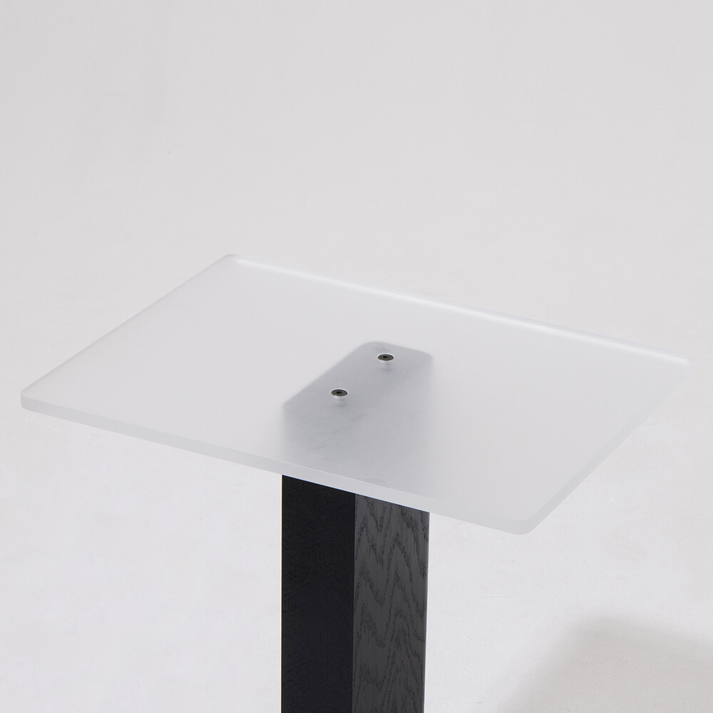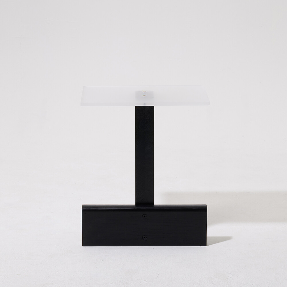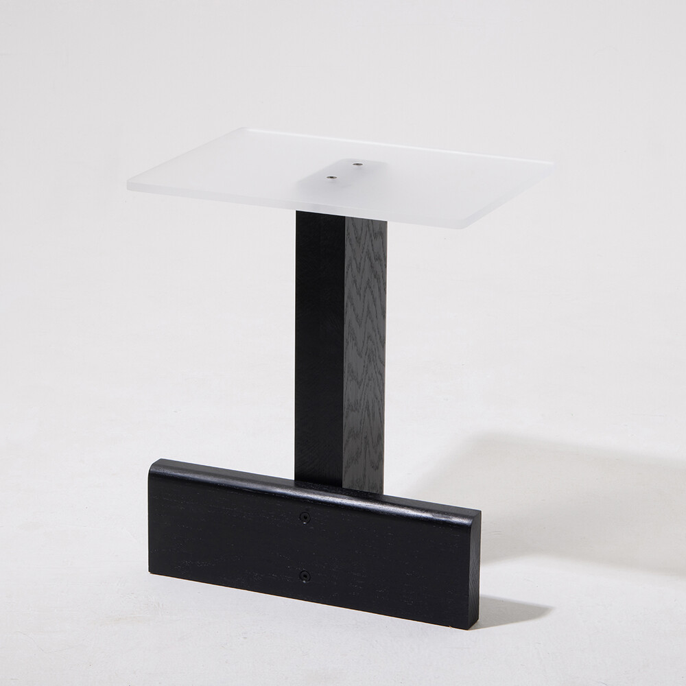 권이안의 ‘무게’시리즈 연작 중 사이드 테이블_스퀘어입니다. 가로, 세로의 간결한 구조의 다리에 반투명의 아크릴 상판으로 구성돼 있습니다. 검정색으로 마감 된 묵직한 느낌의 나무와 반투명의 아크릴이 대조되면서도 조화를 이룹니다. 권이안만의 소재 마감법 미스티(Misty) 마감 처리 된 상판은 스크래치에 취약한 투명 아크릴의 단점을 보완했습니다.