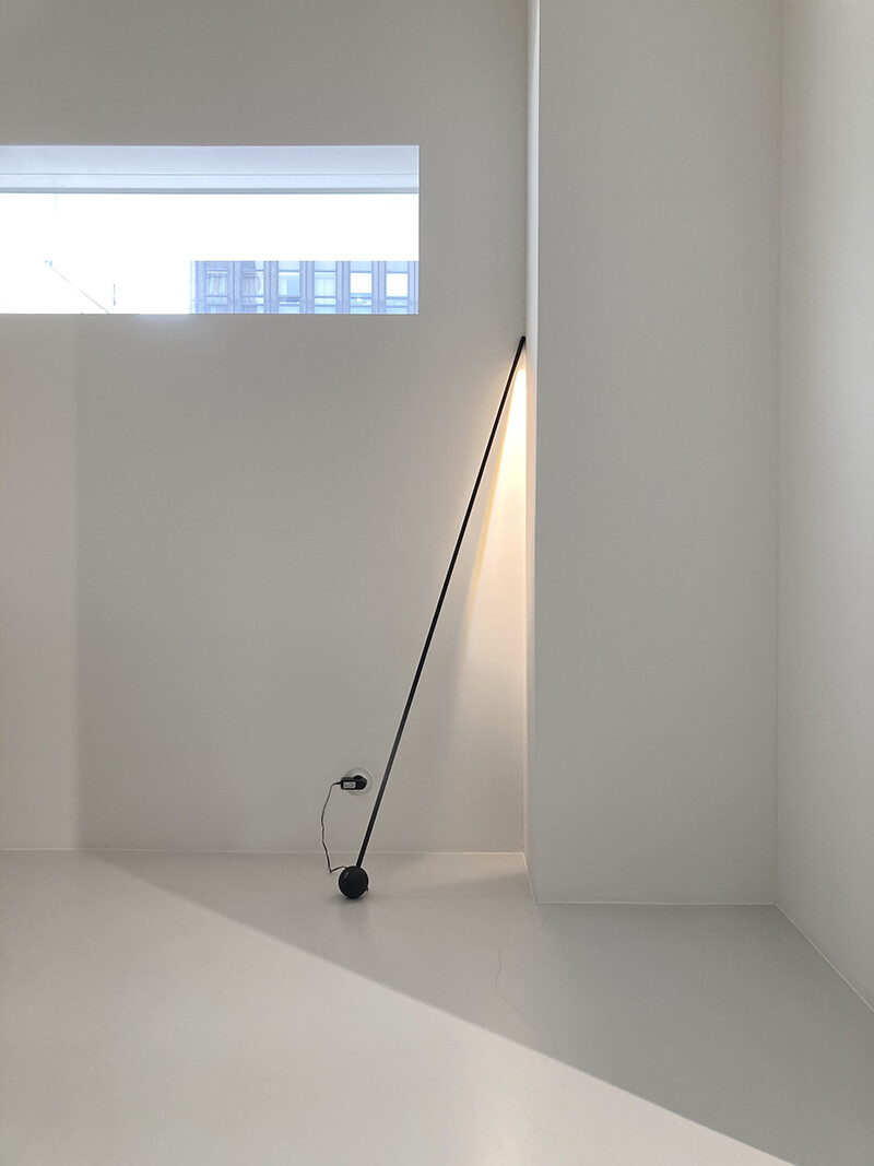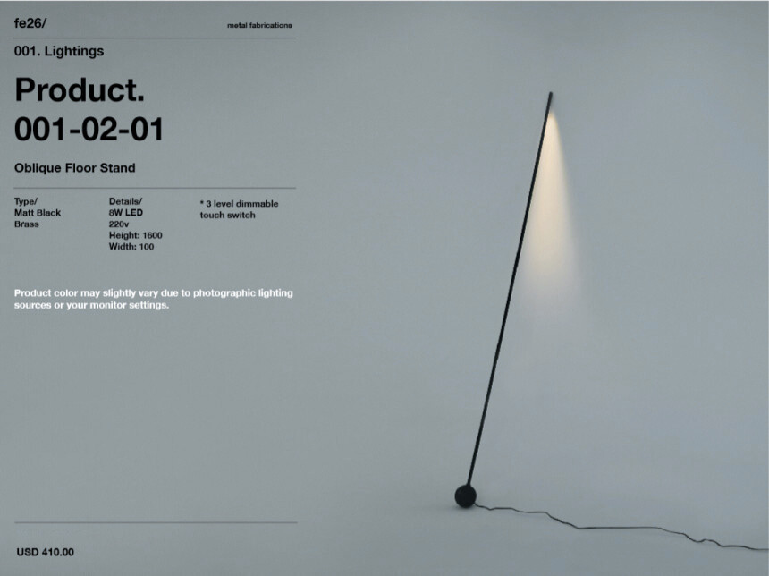 메탈 페브리케이션 브랜드 FE26의 플로어 스탠드 램프입니다. 02 램프는 철과 알루미늄으로 제작된 LED 램프로 원형의 본체가 특징이며 벽에 기대어 간접등의 형태로 사용하는 램프입니다. 별도의 스위치가 없는 터치식 센서로 3단계 밝기 조절이 가능합니다.