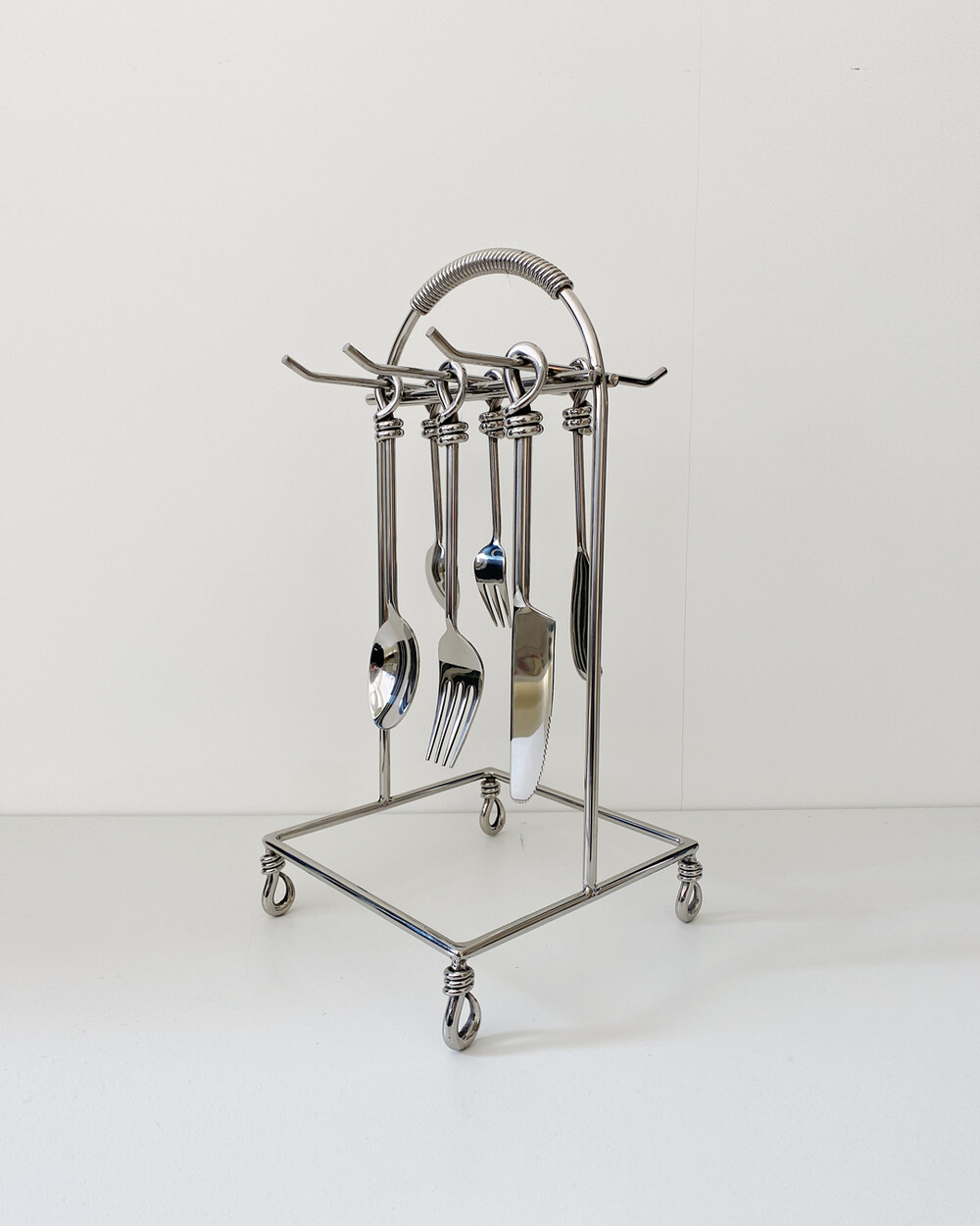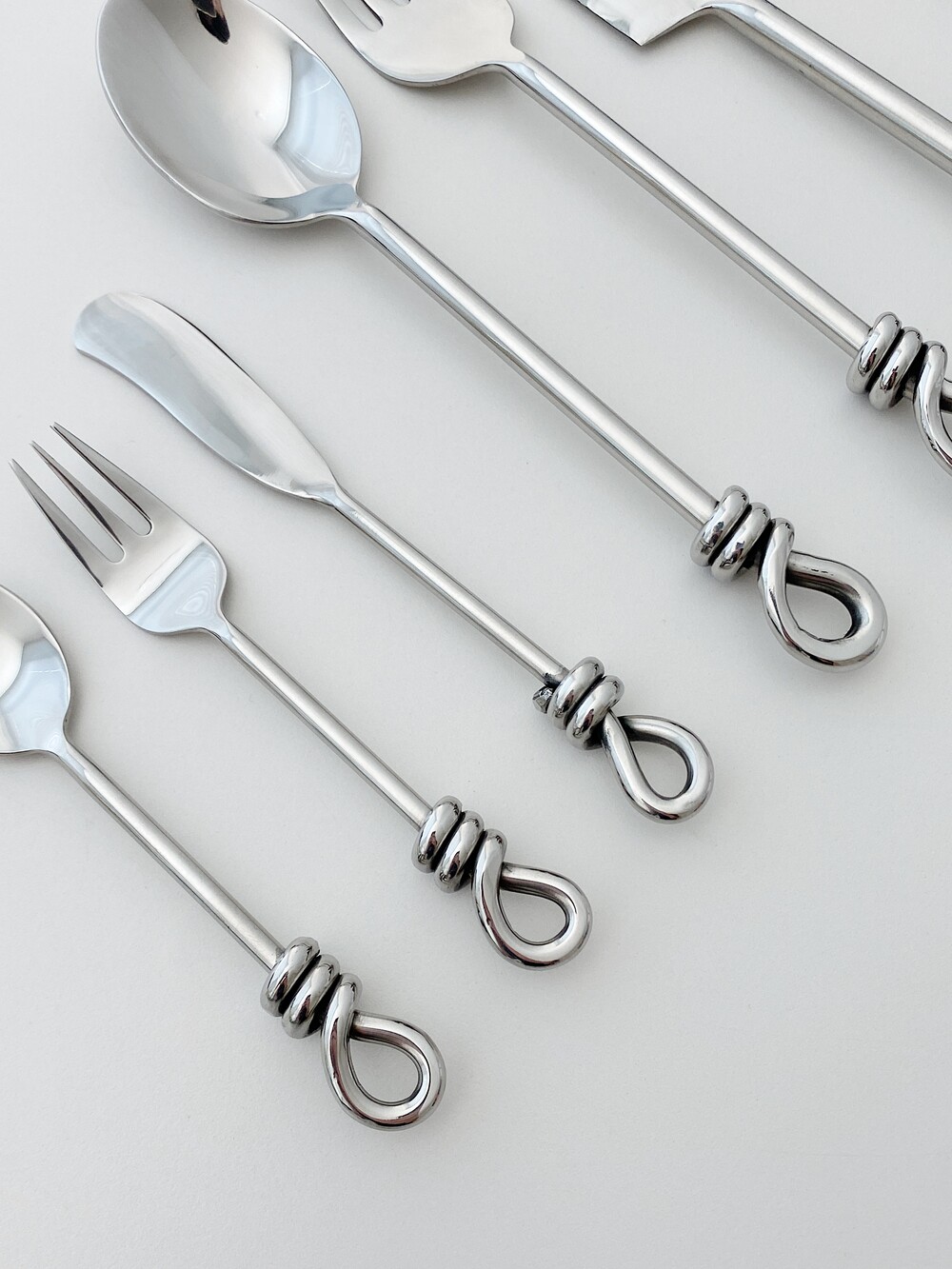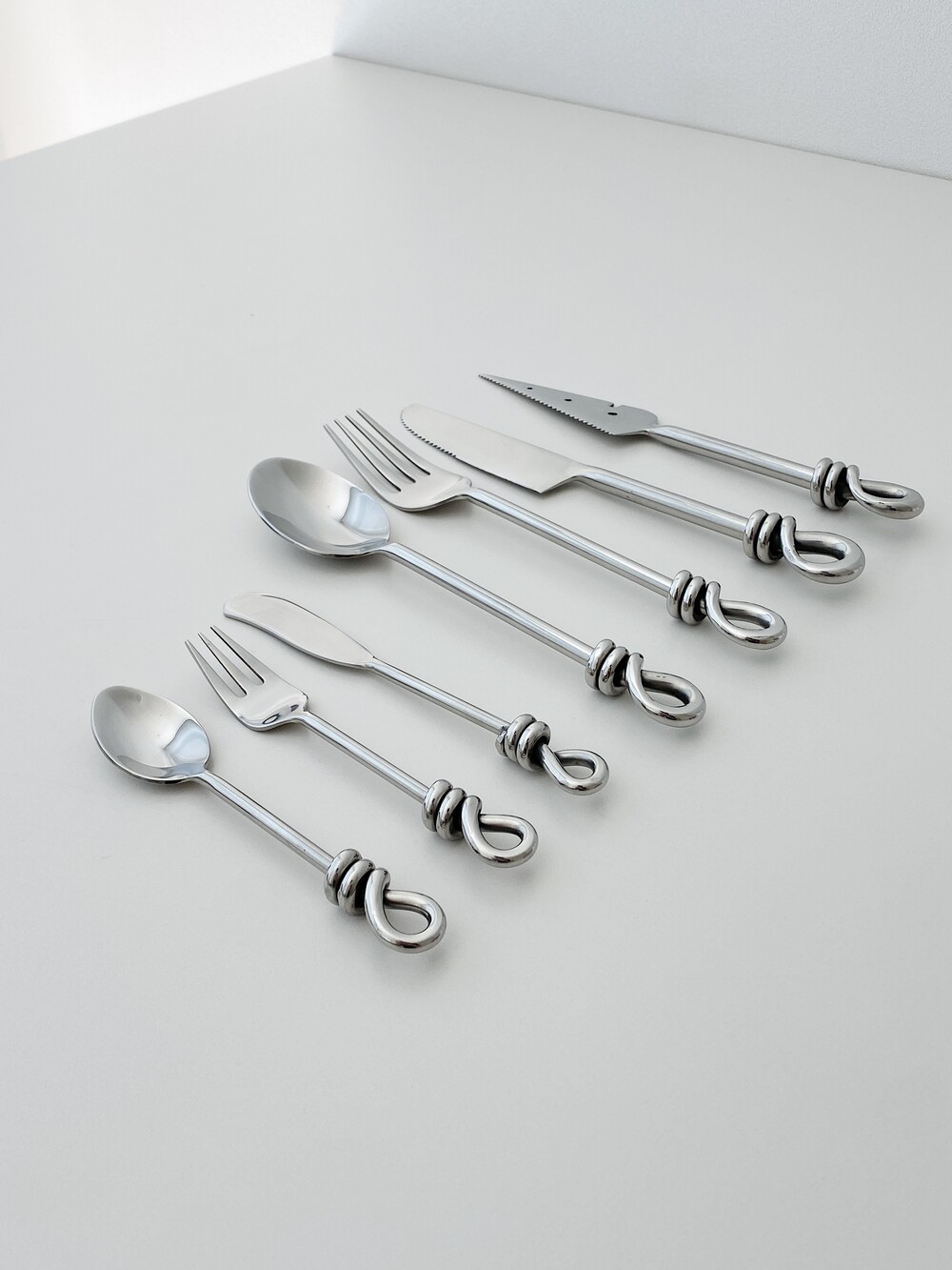 매듭 디자인의 스테인레스 커트러리 시리즈입니다. 태국 현지 장인의 손길을 통해 모두 수작업으로 제작됩니다. 묵직하면서 그립감이 좋아 편하고 즐거운 식사시간을 즐길 수 있습니다. 행잉 스탠드와 함께 테이블 세팅을 하면 풍성하고 완성도 있는 테이블을 만들어줍니다.