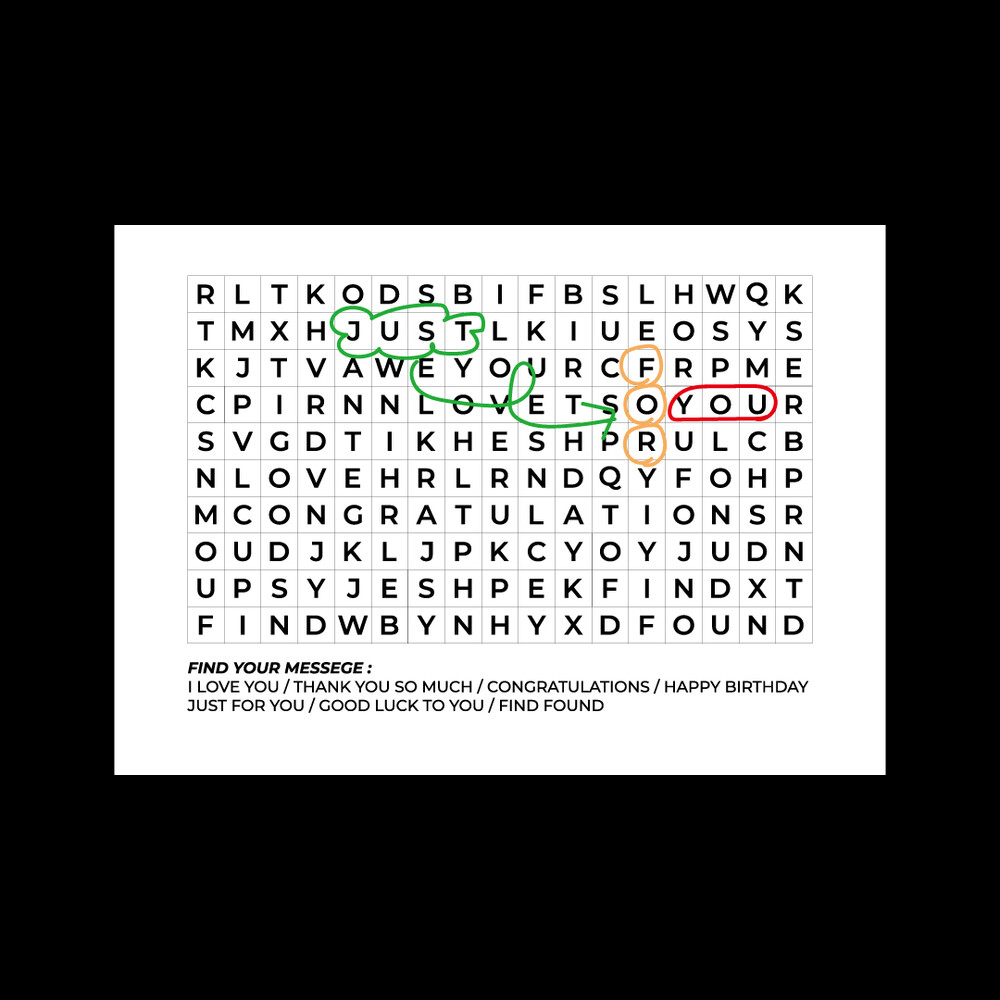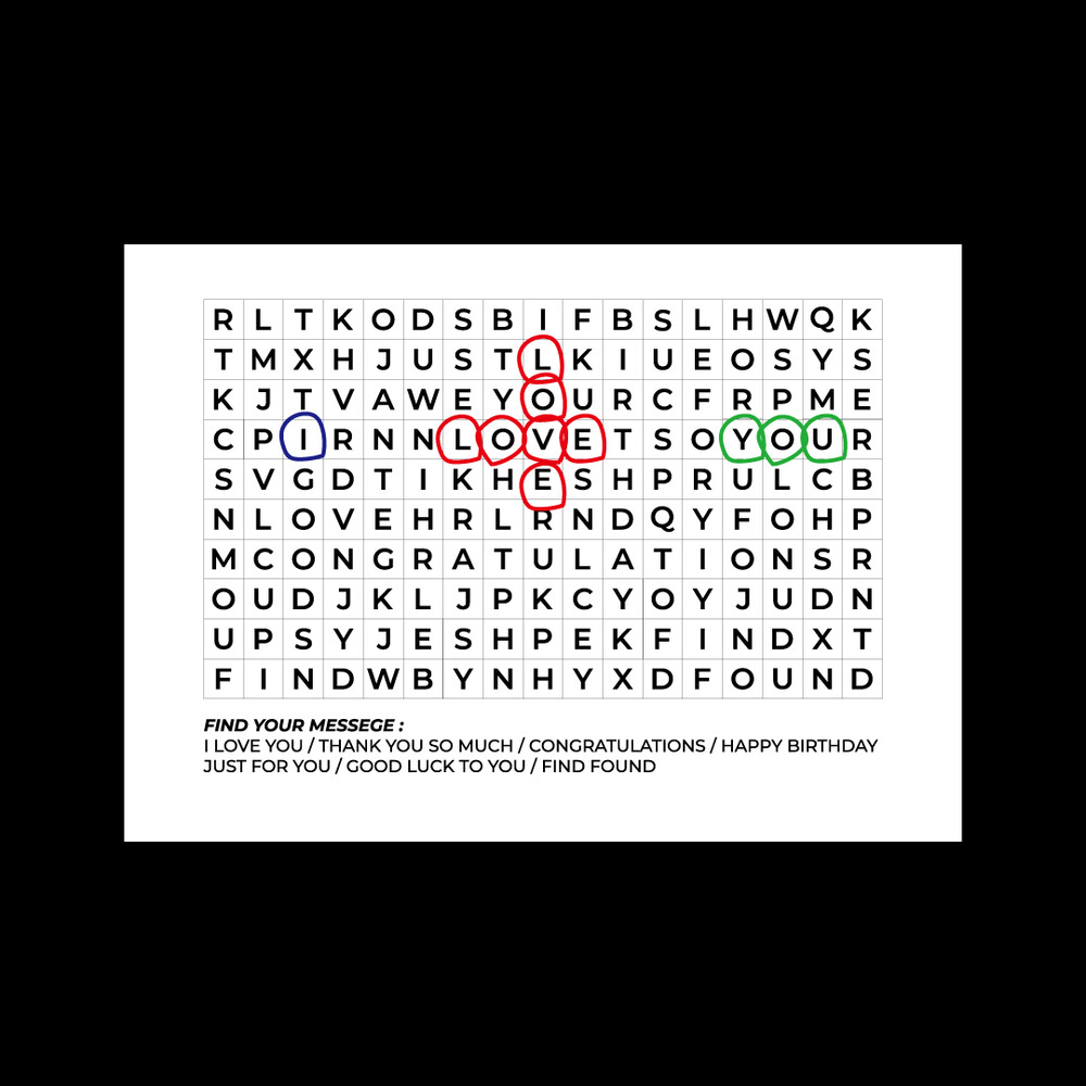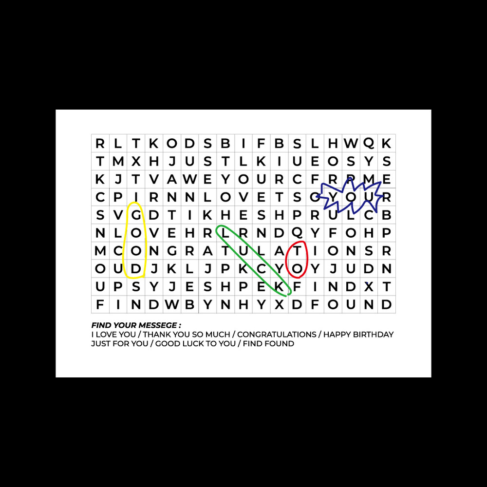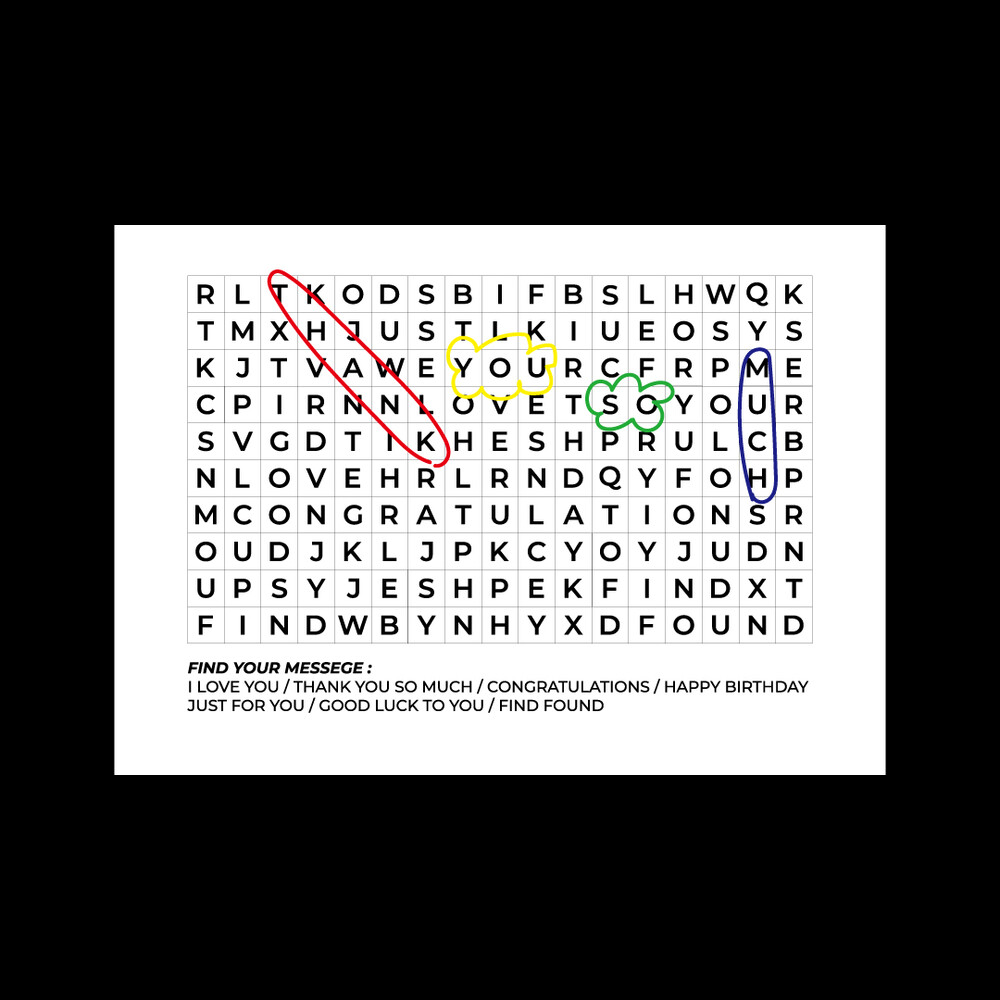 찾아가는 재미가 있는 파인드 파운드 퍼즐 메세지 카드입니다. 보기의 메세지를 퍼즐에서 찾아 마음을 전해보세요!