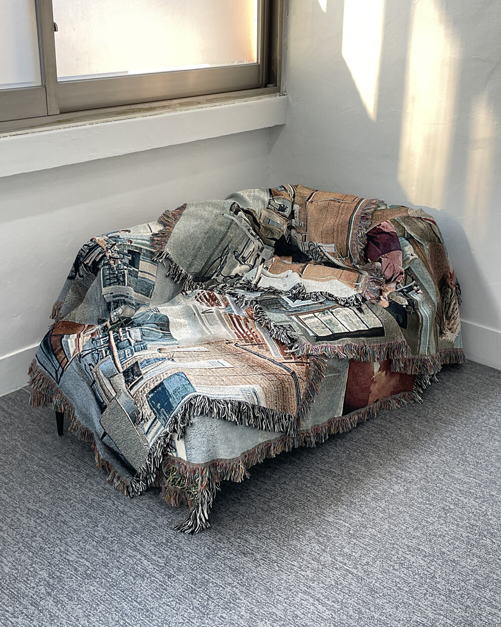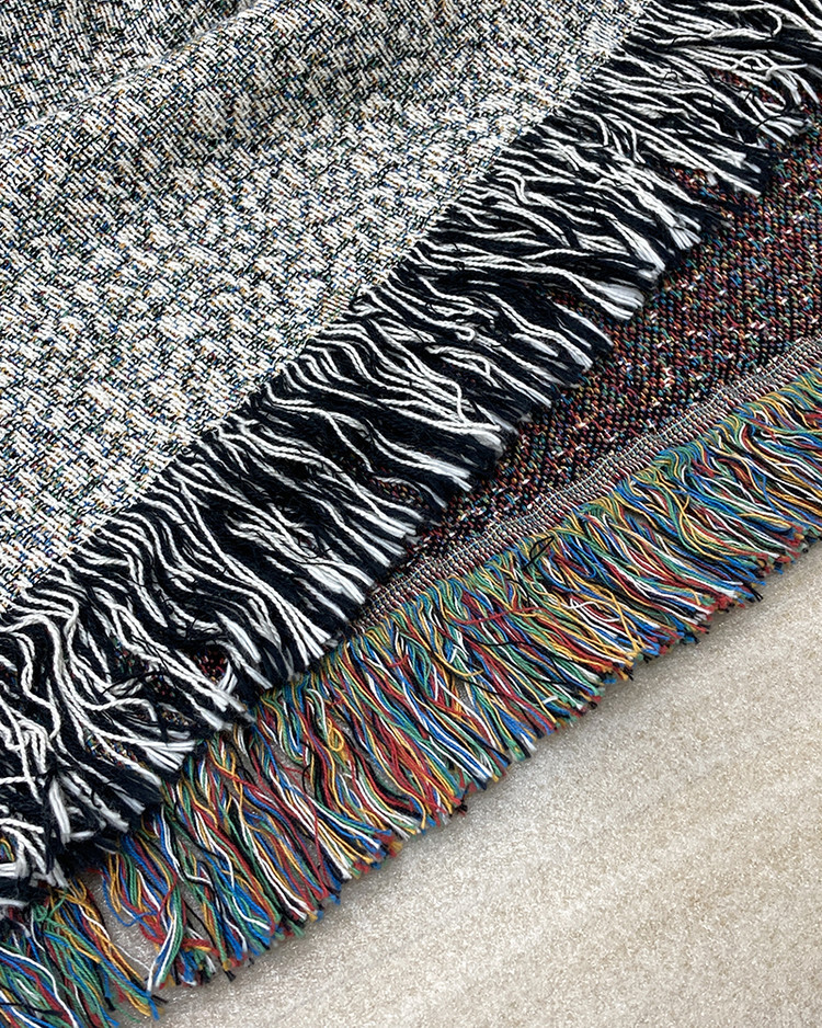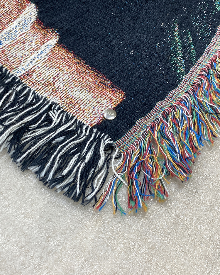면사를 사용해 직조형식으로 제작된 블랭킷입니다. 벽에 걸어 놓거나 소파나 테이블을 덮는 용도, 또는 담요나 카페트로 사용할 수도 있습니다. 원단에 단순 프린트한 것이 아니라 색 실의 짜임으로 아트웍을 표현하였습니다. 때문에, 이미지 손상없이 반 영구적으로 사용이 가능합니다. 또한, 코튼만을 사용했기 때문에 부드러운 터치감과 관리가 편하다는 것이 장점입니다.