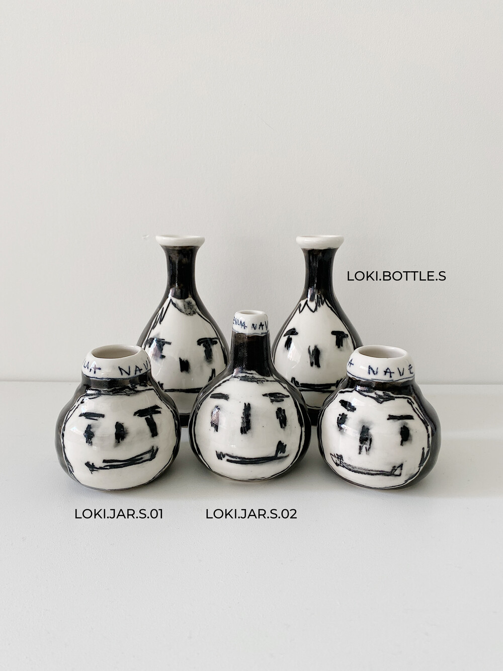 로키시리즈는 사방이 볼록한 면에 로키의 두 표정이 그려진 항아리 시리즈입니다. 단조롭고 고운 형태의 항아리에 그려진, 거칠고 생기있는 로키의 표정이 매력적입니다. 무드에 따라 항아리의 방향을 달리 배치해보세요.