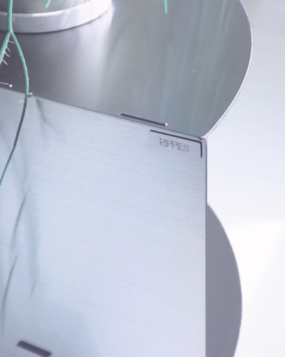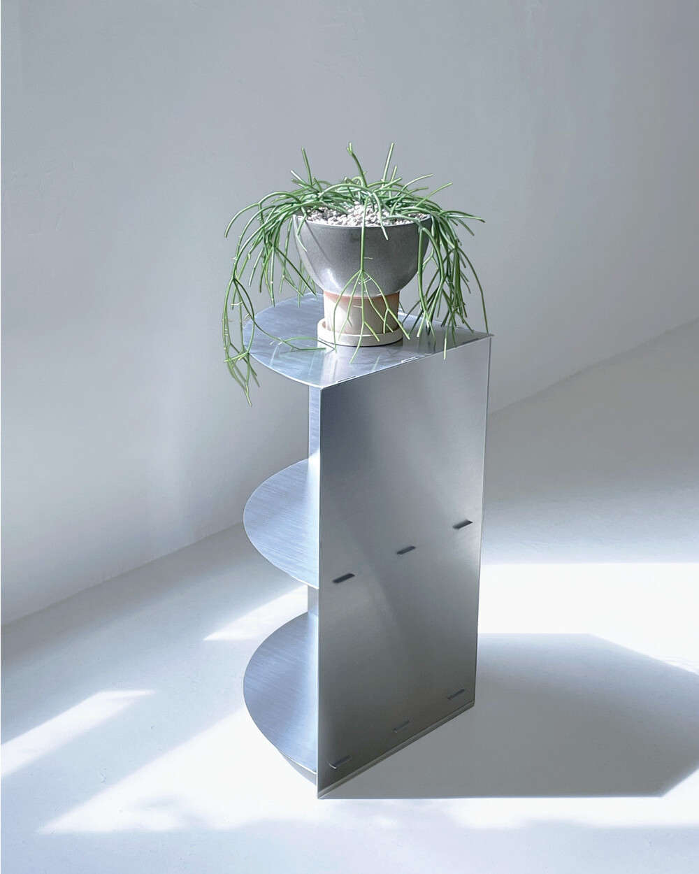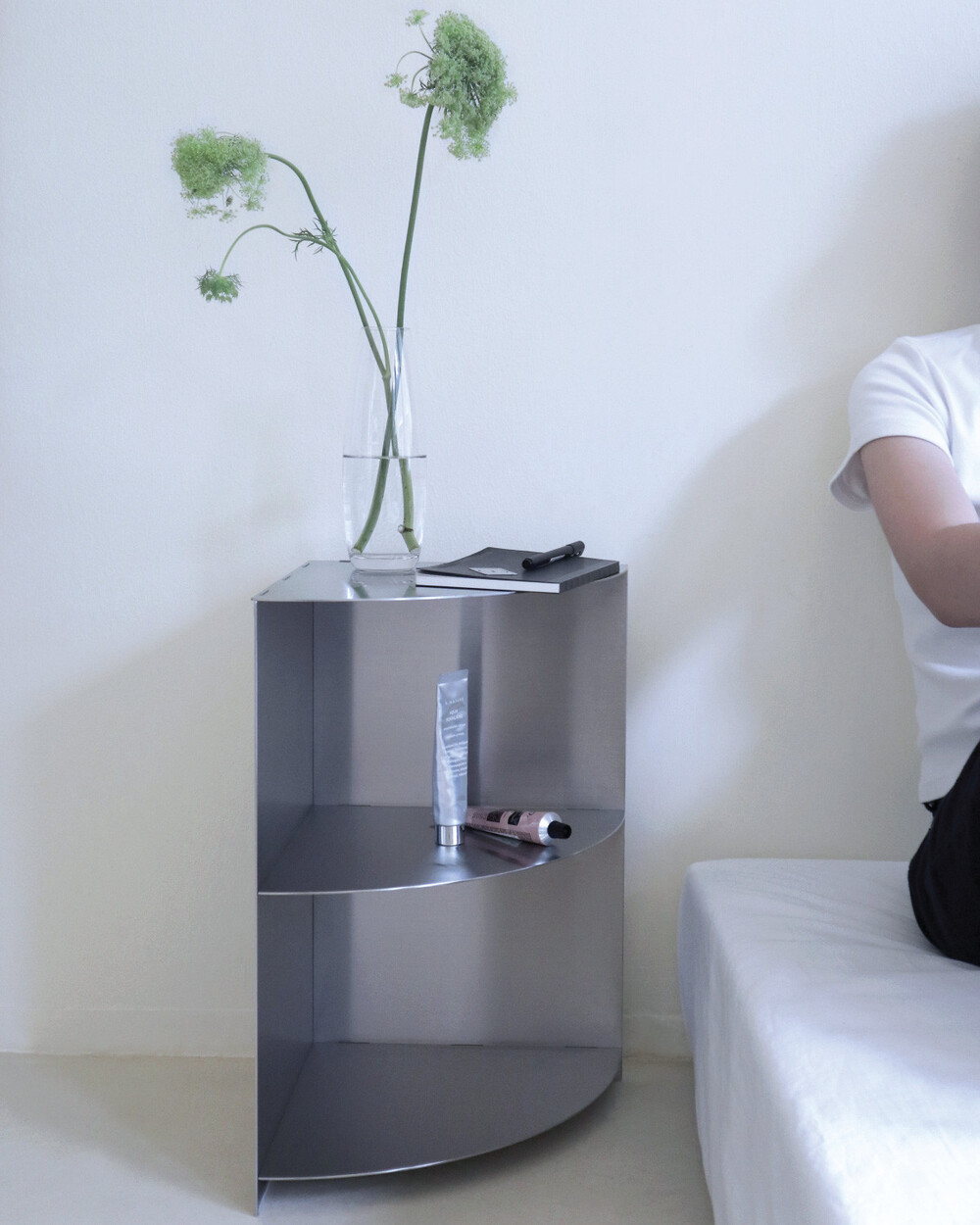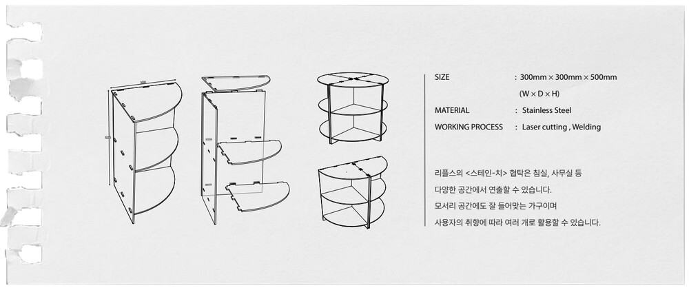 리플스의 <스테인-치> 사이드테이블입니다.다른 재료의 사용 없이 스테인리스로만 제작되어 견고하며 깔끔한 연결이 돋보입니다. 스테인리스의 강한 재료적 특성과 바느질 형태에서 보이는 부드러운 섬유적 특성이 매력적인 대조를 보여줍니다.각 판을 조립 후 용접 처리까지 하여 뛰어난 내구성을 지니며, 대량생산과는 다른 깔끔한 마감을 만들어냈습니다.