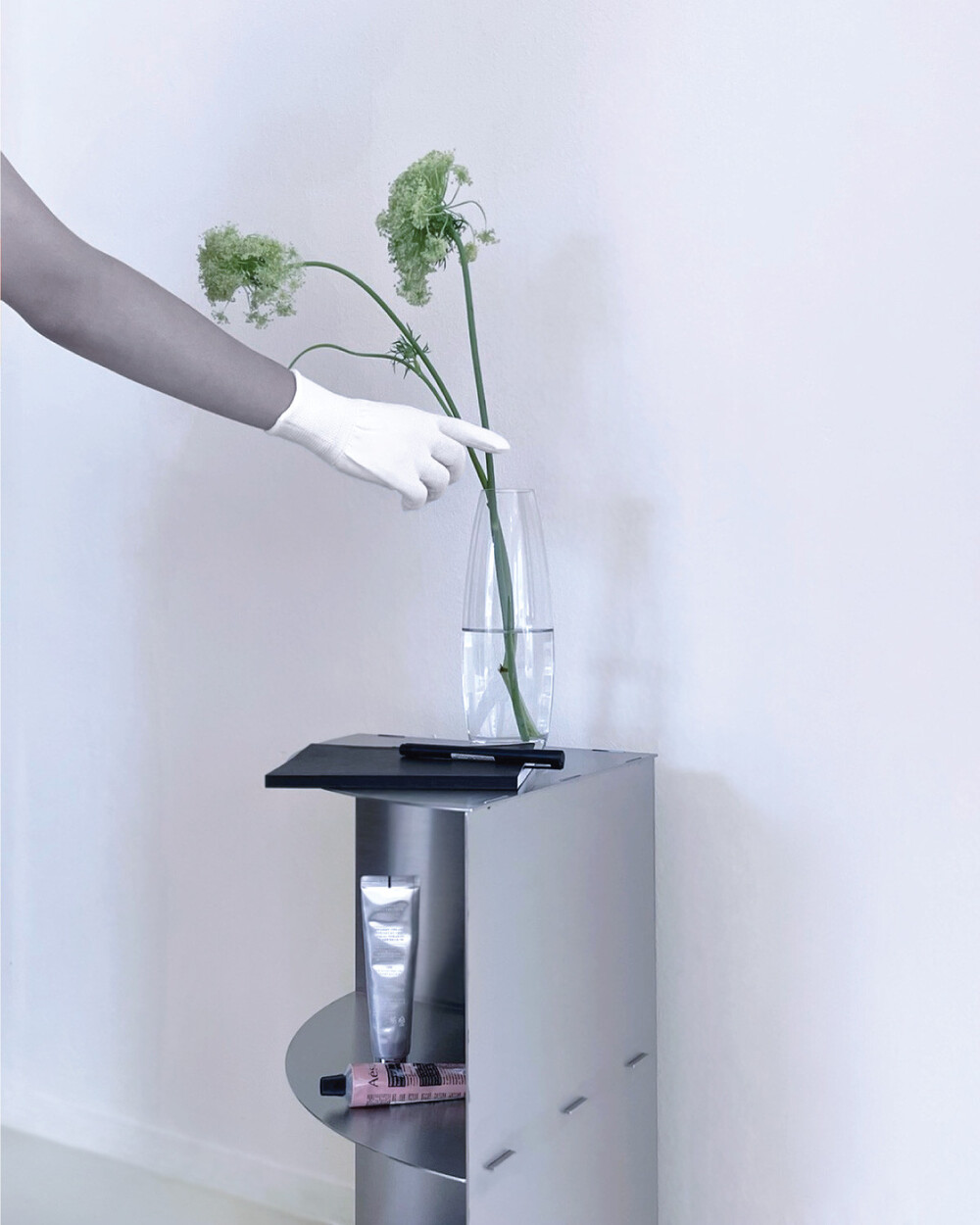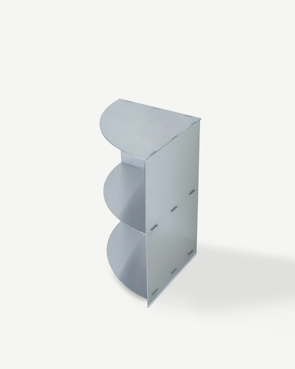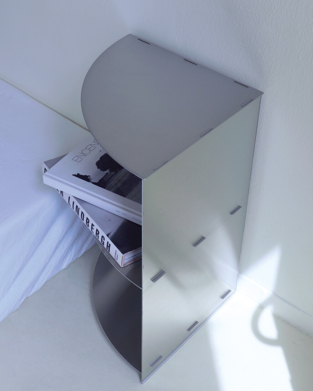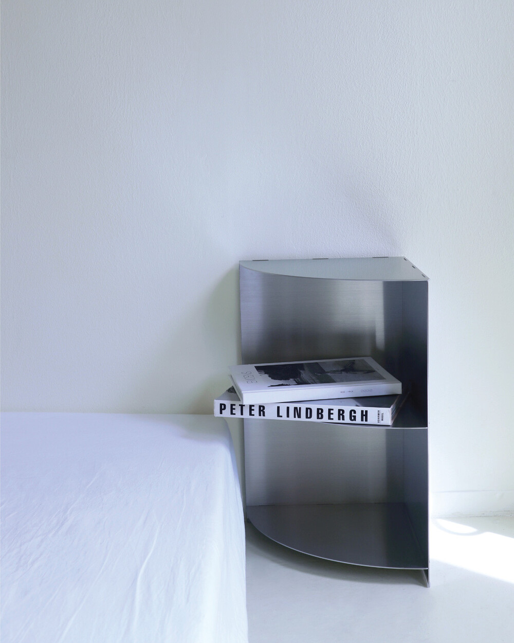 리플스의 <스테인-치> 사이드테이블입니다.다른 재료의 사용 없이 스테인리스로만 제작되어 견고하며 깔끔한 연결이 돋보입니다. 스테인리스의 강한 재료적 특성과 바느질 형태에서 보이는 부드러운 섬유적 특성이 매력적인 대조를 보여줍니다.각 판을 조립 후 용접 처리까지 하여 뛰어난 내구성을 지니며, 대량생산과는 다른 깔끔한 마감을 만들어냈습니다.