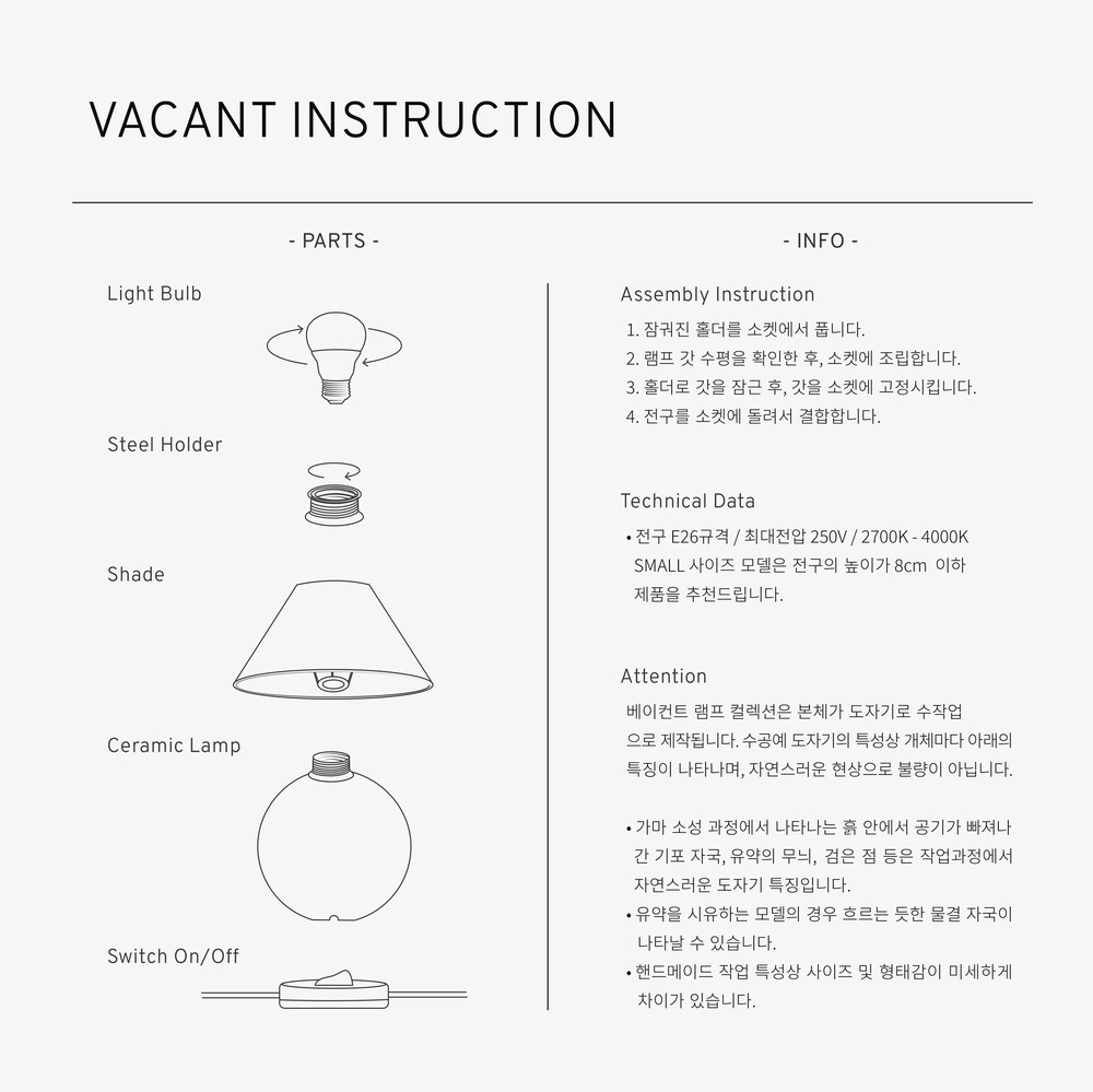 - 베이컨트 램프 컬렉션은 본체가 도자기로 물레성형으로 제작되어, 도자기 작업의 특성상 개체마다 아래의 특징이 나타나며, 자연스러운 현상으로 불량이 아닙니다. 구매시 참고 부탁드립니다.