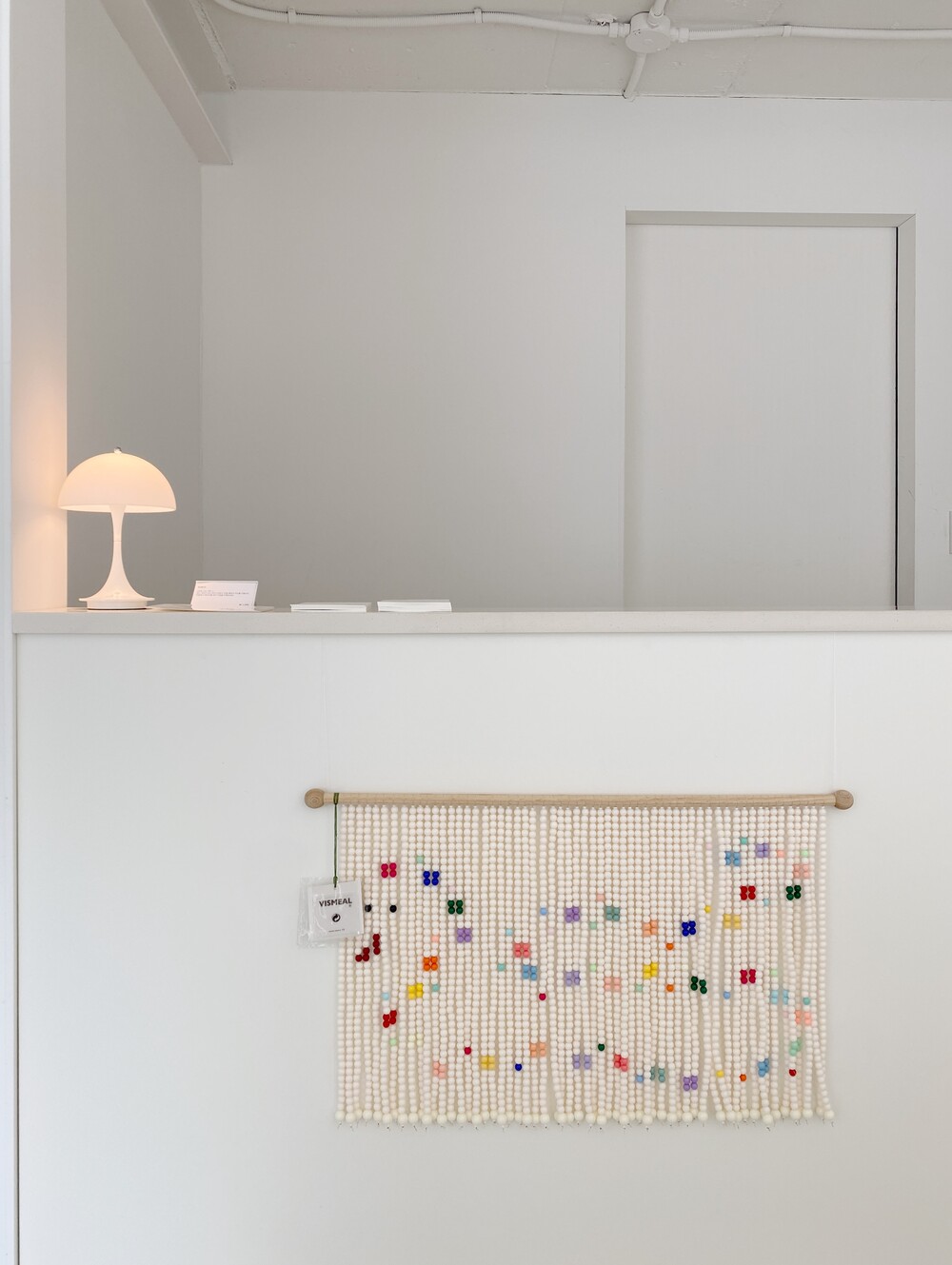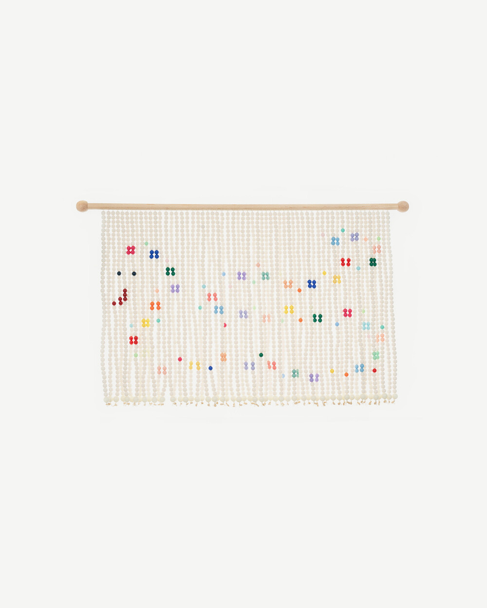 구슬을 하나하나 끼워서 포스터 형식으로 제작한 오브제입니다. 벽에 걸어두거나 혹은 할머니의 주방 입구에 있는 커튼 발처럼 천장에 매달아도 좋습니다.