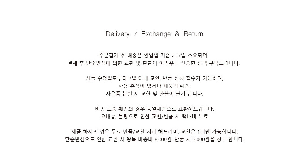- 변심 반품의 경우 왕복배송비를 차감한 금액이 환불되며, 제품 및 포장 상태가 재판매 가능하여야 합니다.